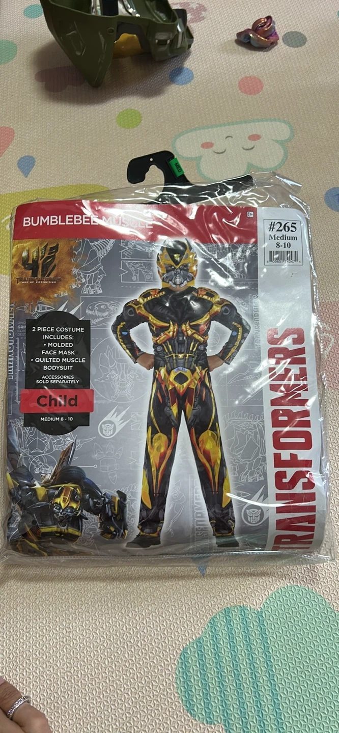 Selling a Bumblebee Muscle Transformers costume for kids! It's a size medium, fitting sizes 8-10. The 2-piece costume includes a molded face mask and a quilted muscle bodysuit. Perfect for dress-up or Halloween!