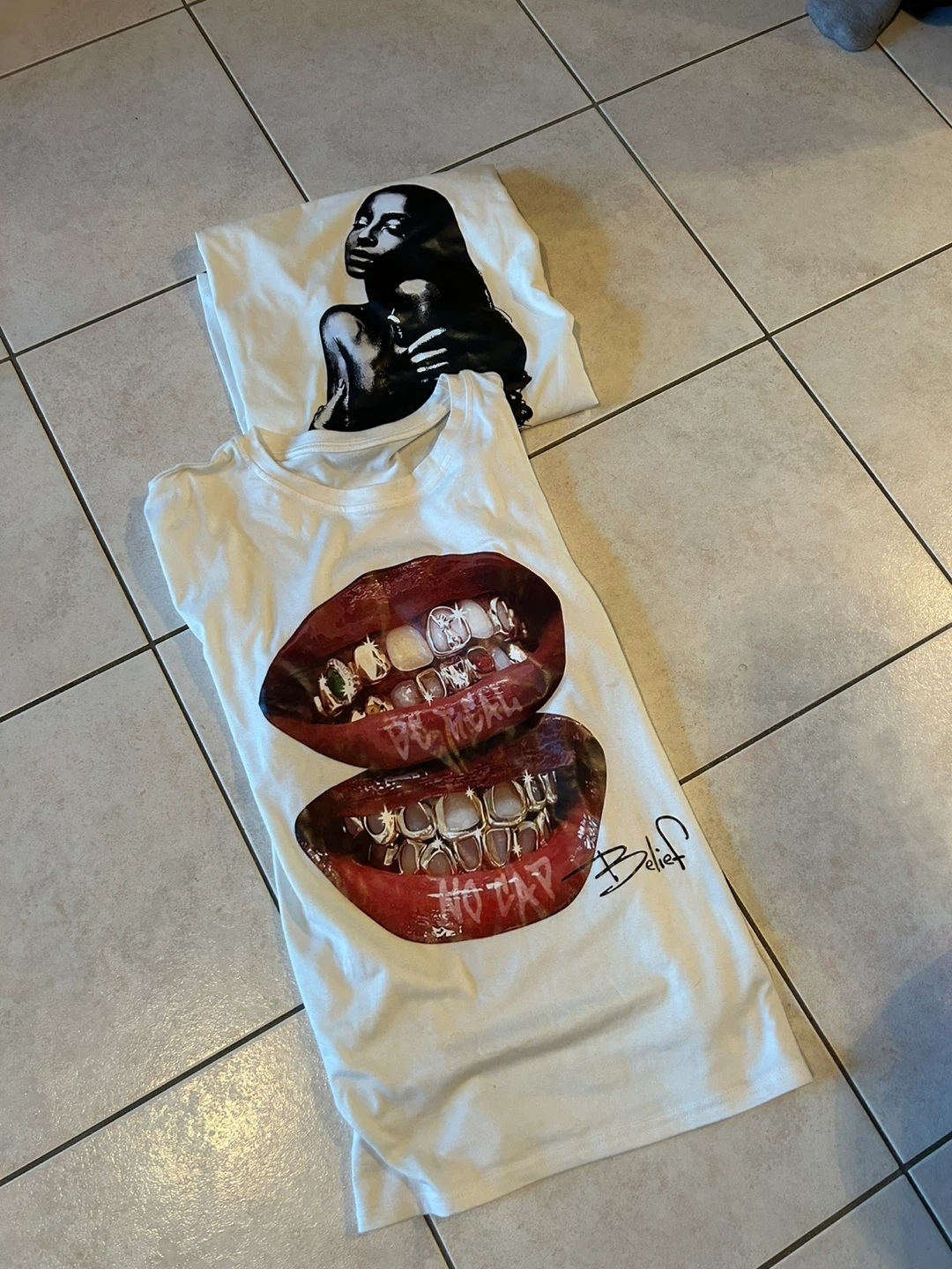 Two graphic print t-shirts for sale. One features a woman's portrait, and the other has a bold lip design with the words 'Be Real' and 'No Cap'. Both are in good condition and ready for a new home $5 each