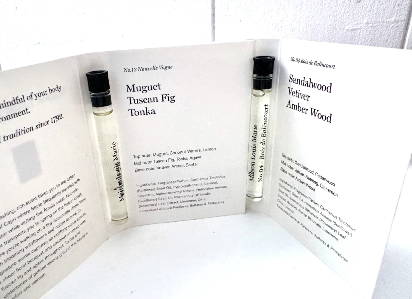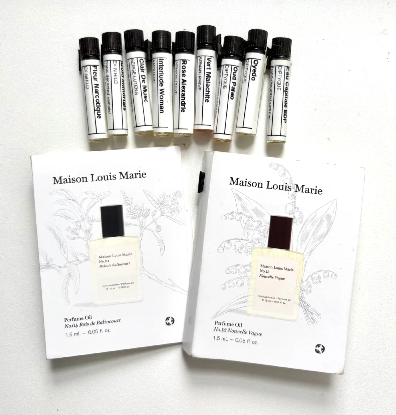 Selling a collection of Maison Louis Marie perfume oil samples No.04 Bois de Balincourt - sold ❌ Notes - sandalwood vetiver and amber wood No.13 Nouvelle Vague Notes - muguet, Tuscan fig and tonka Also includes a variety of samples from other brands like Diptyque, Armani Prive, and Serge Lutens each 1 ml Diptyque - oyedo, old palao, eau capitale Armani prive - rose Alexandria and very malachite Interlude woman amoulage Clair de musc serge lutens Ex nihilo - fleur narcotique & gold immortals Willing to trade for right fragrances Pick up please