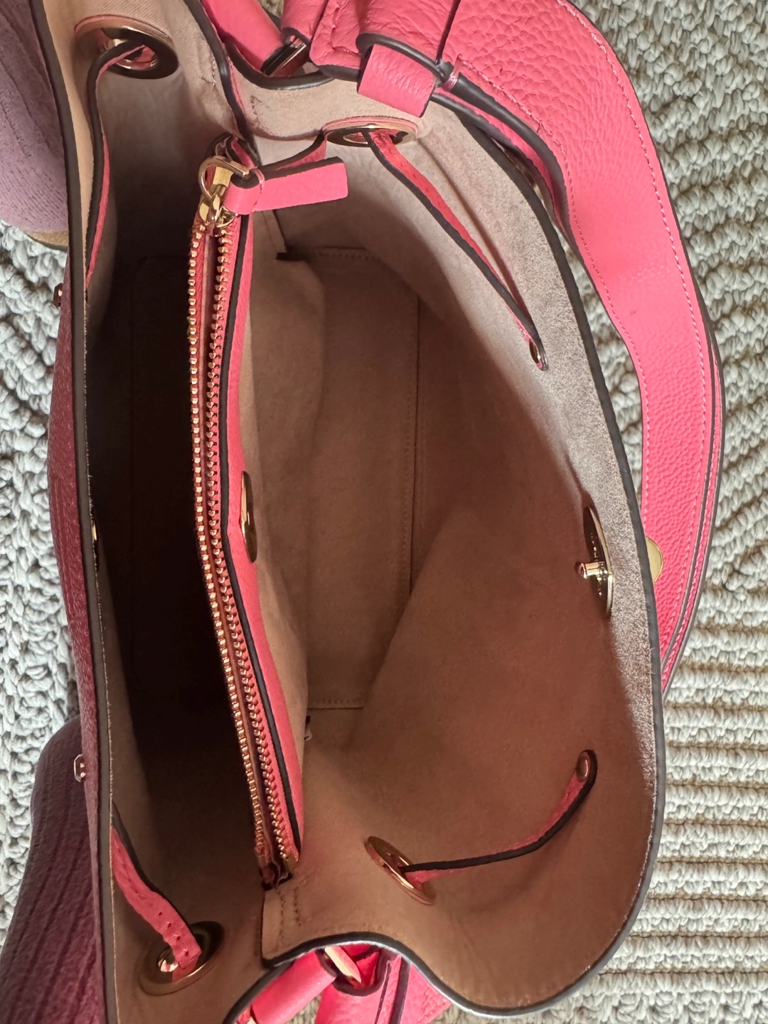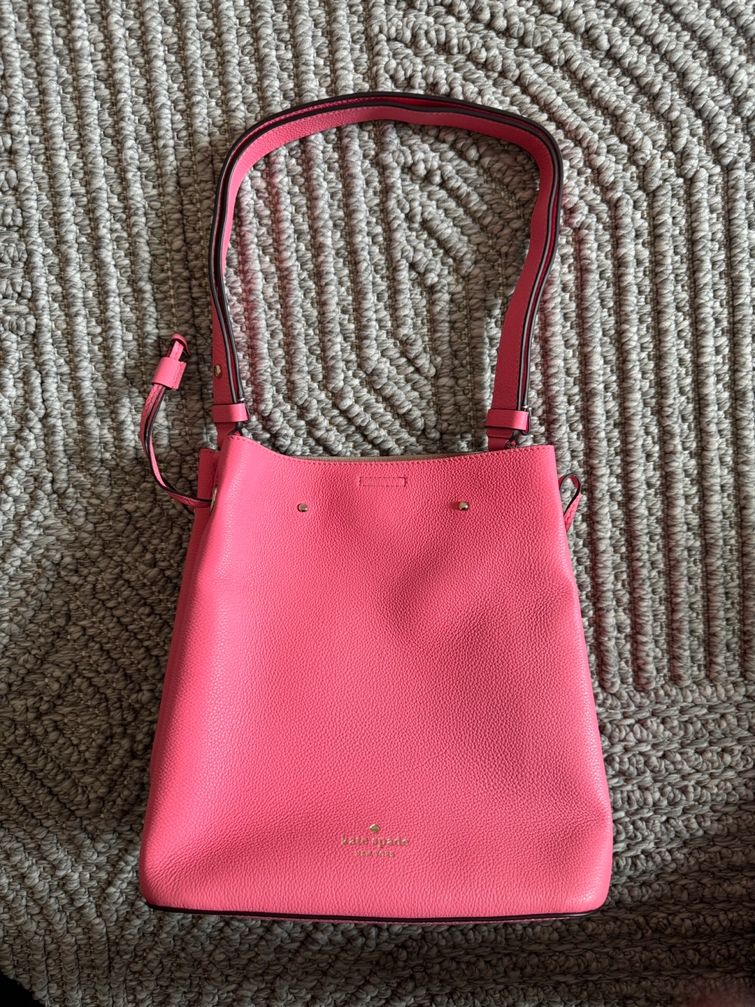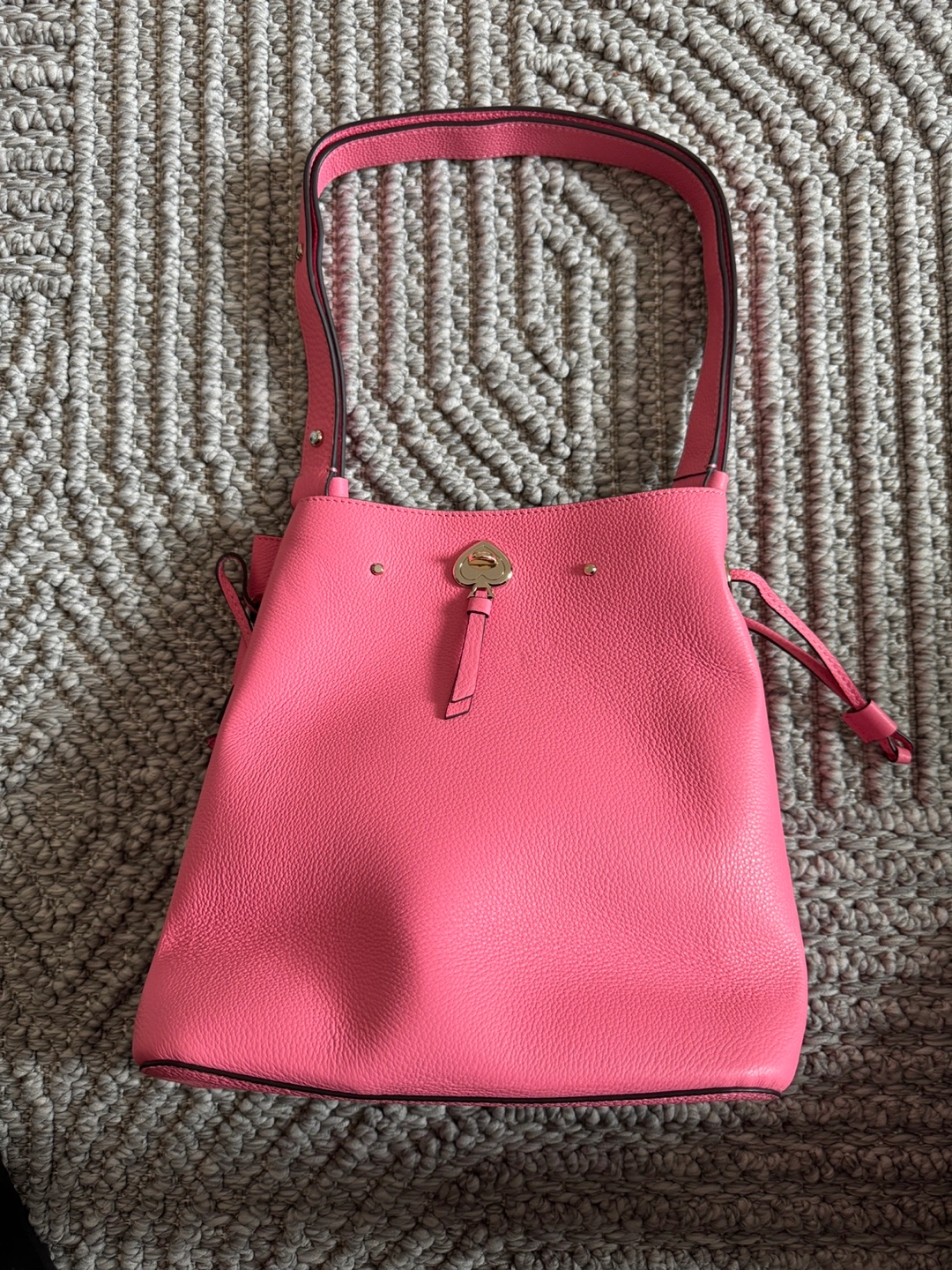 Selling a Kate Spade bucket bag in a lovely shade of pink! It's made of leather and has a drawstring closure. The interior has a zip pocket for keeping your valuables safe and sound. It's in great condition and ready for a new home.