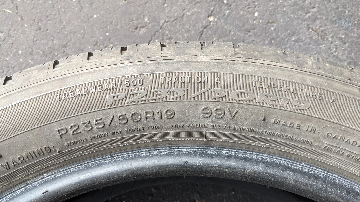 Selling a Michelin tire, size P235/50R19. It has a treadwear rating of 500 and traction A. Ready for pickup!