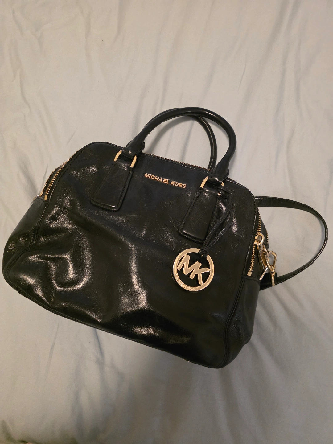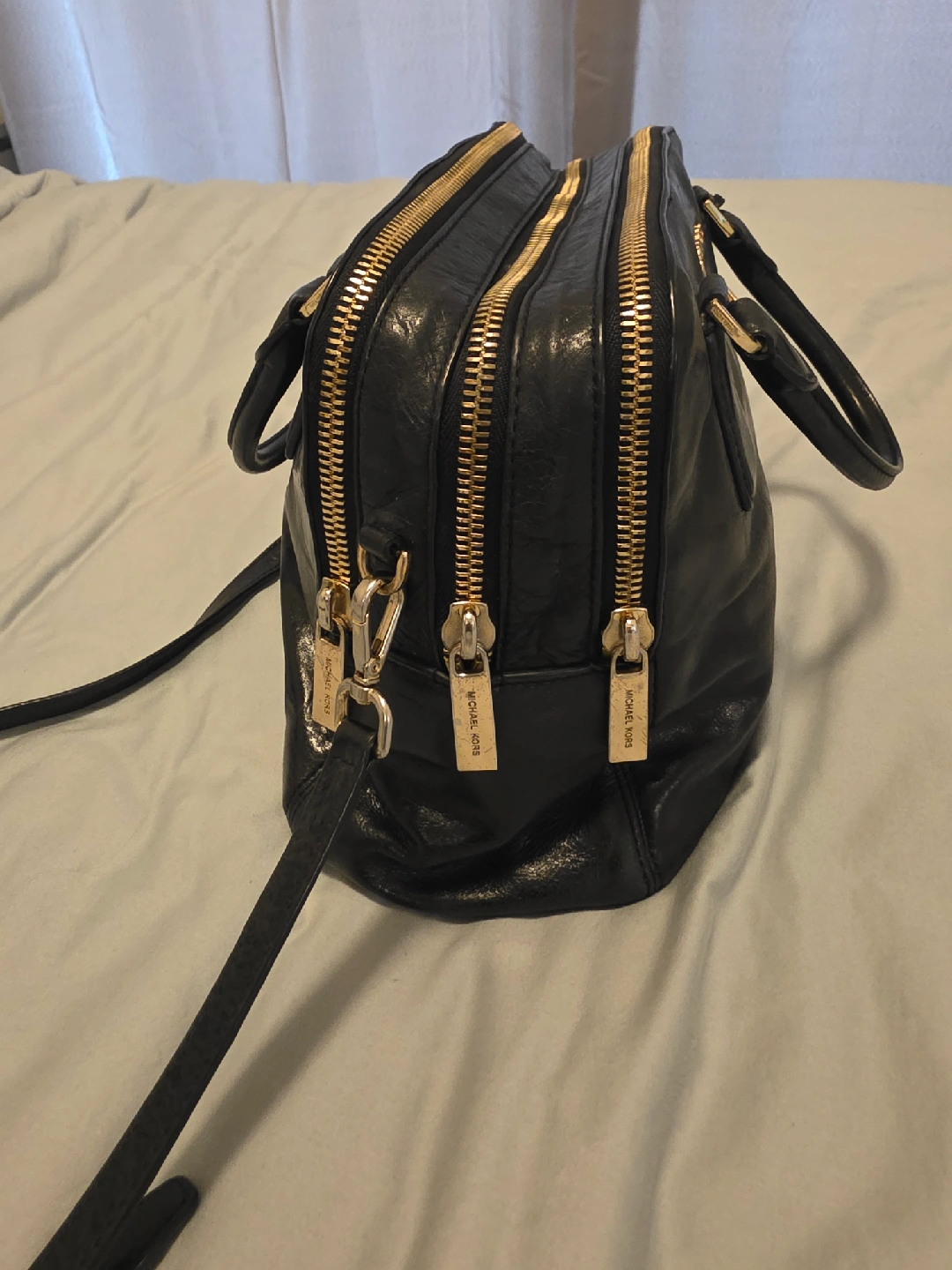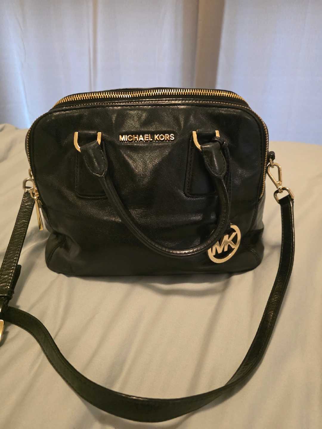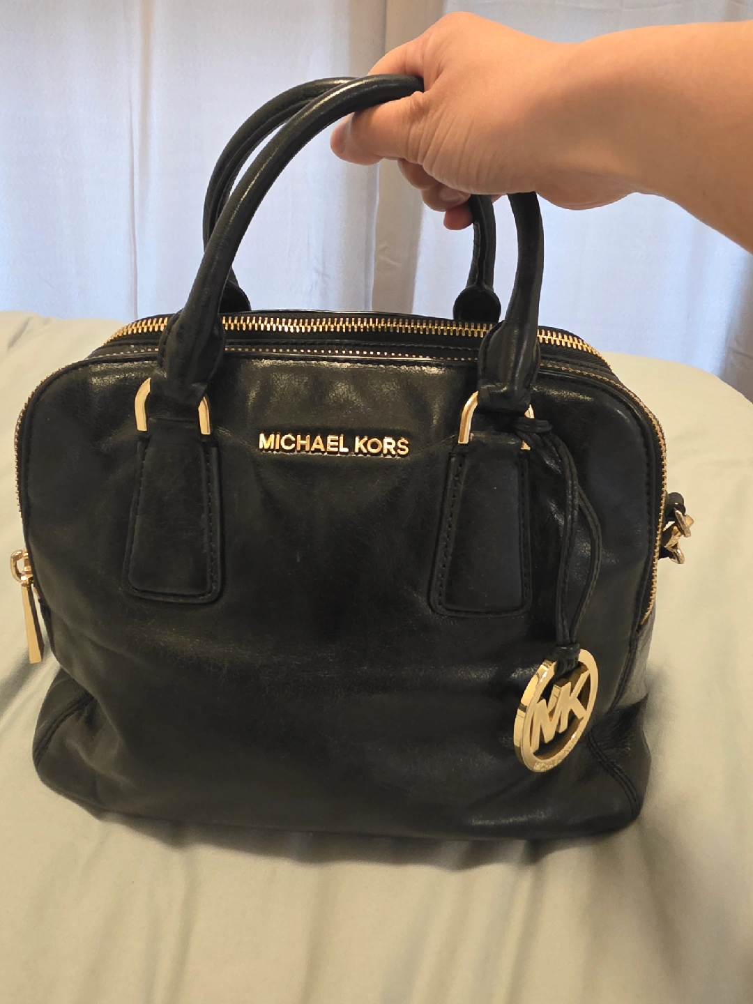 Selling a gently used Michael Kors black leather satchel. It has gold-tone hardware and a detachable shoulder strap. The interior has multiple compartments for organization. It's a stylish and practical bag for everyday use!