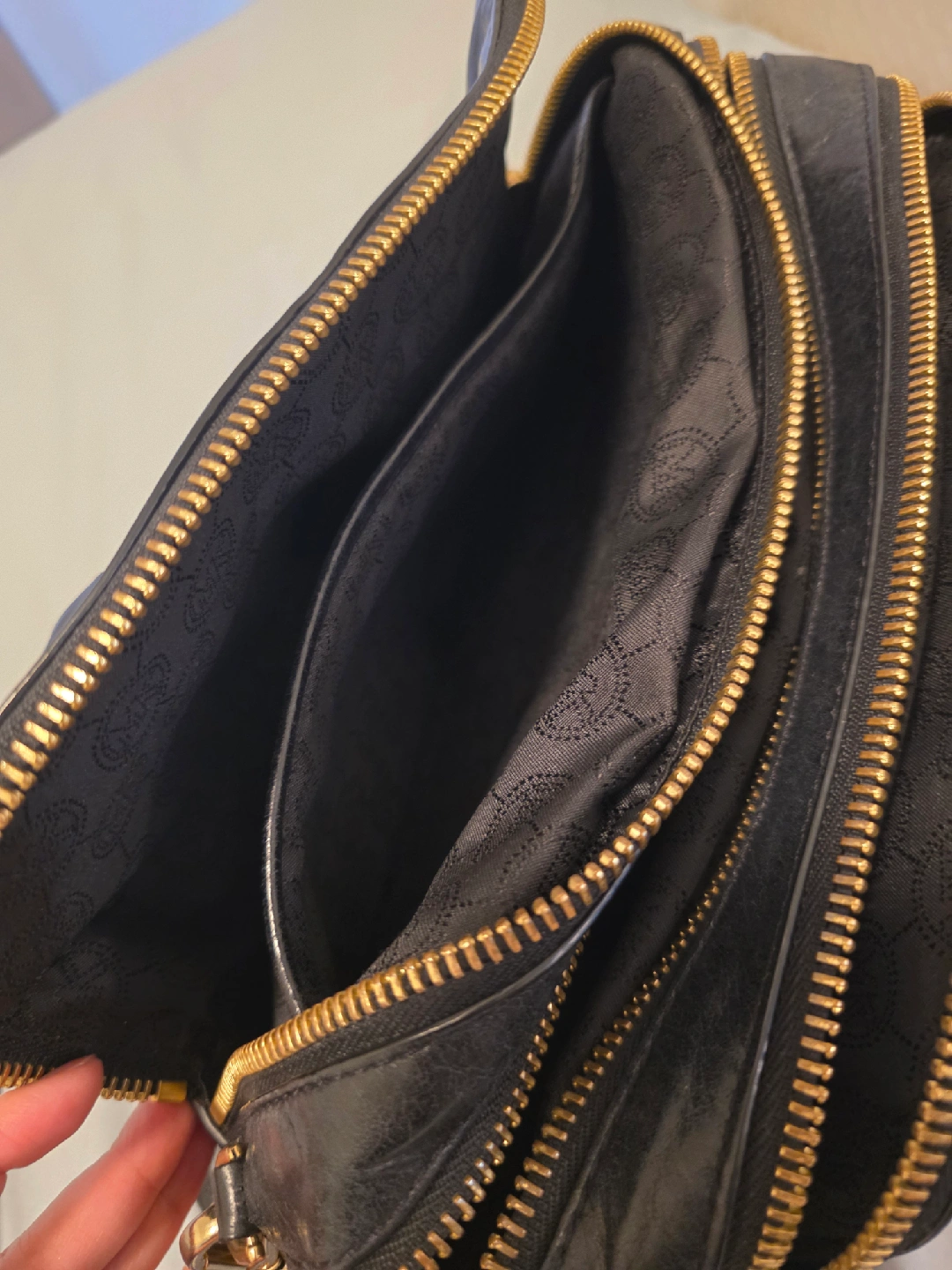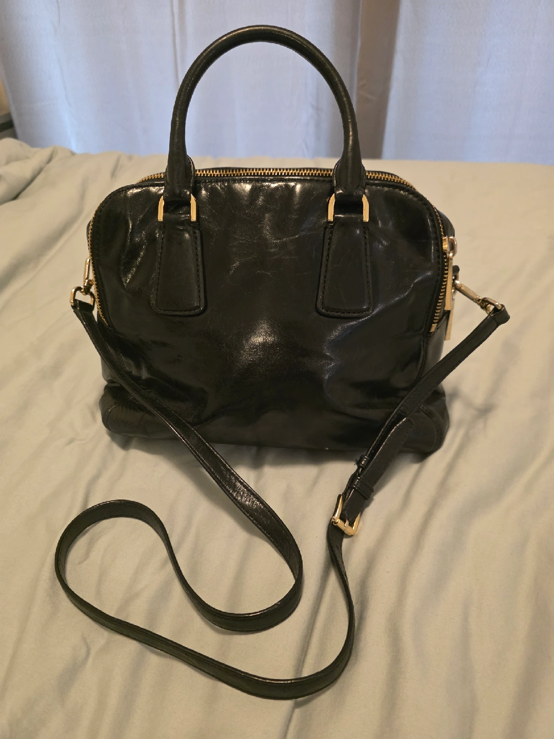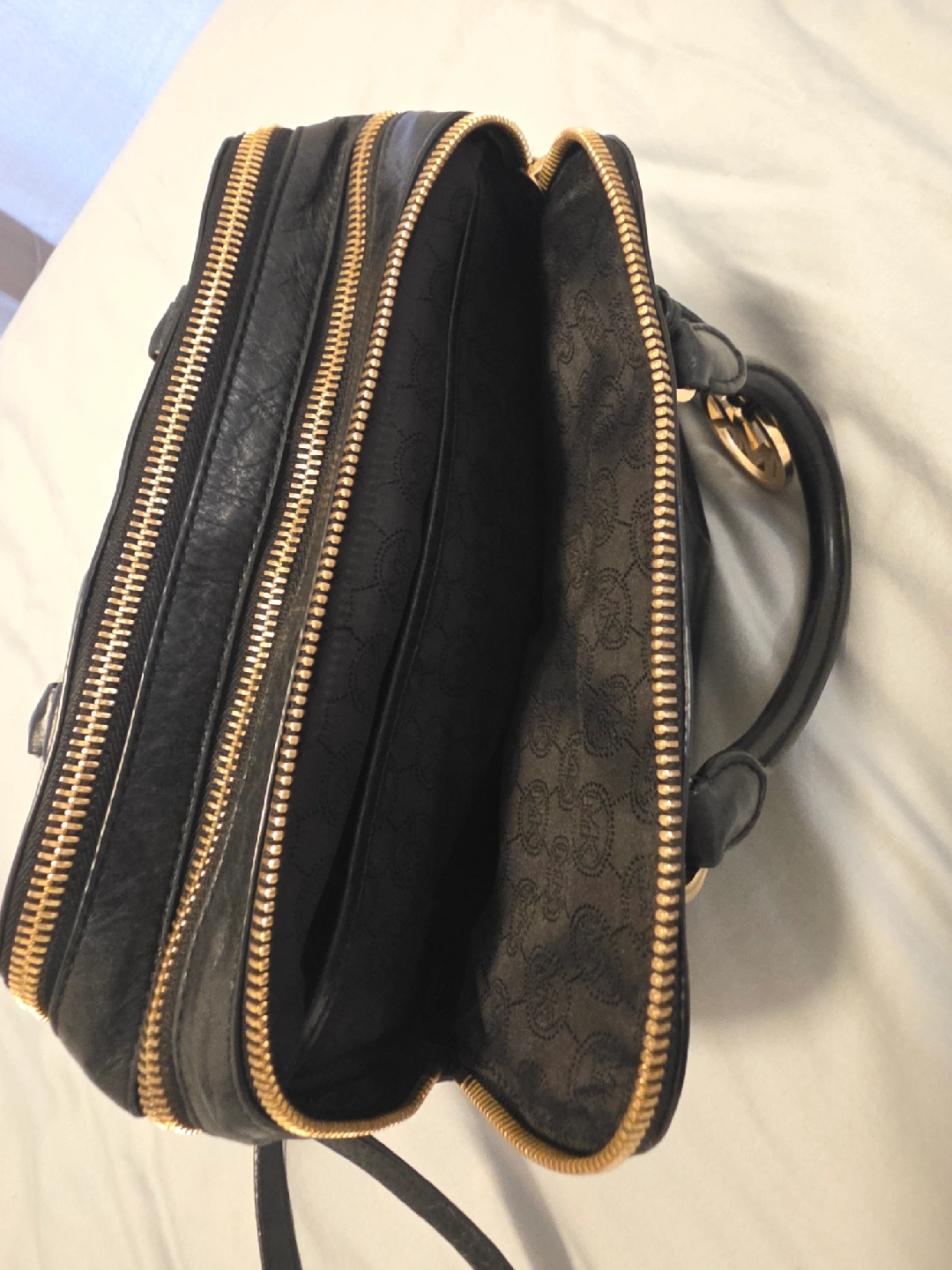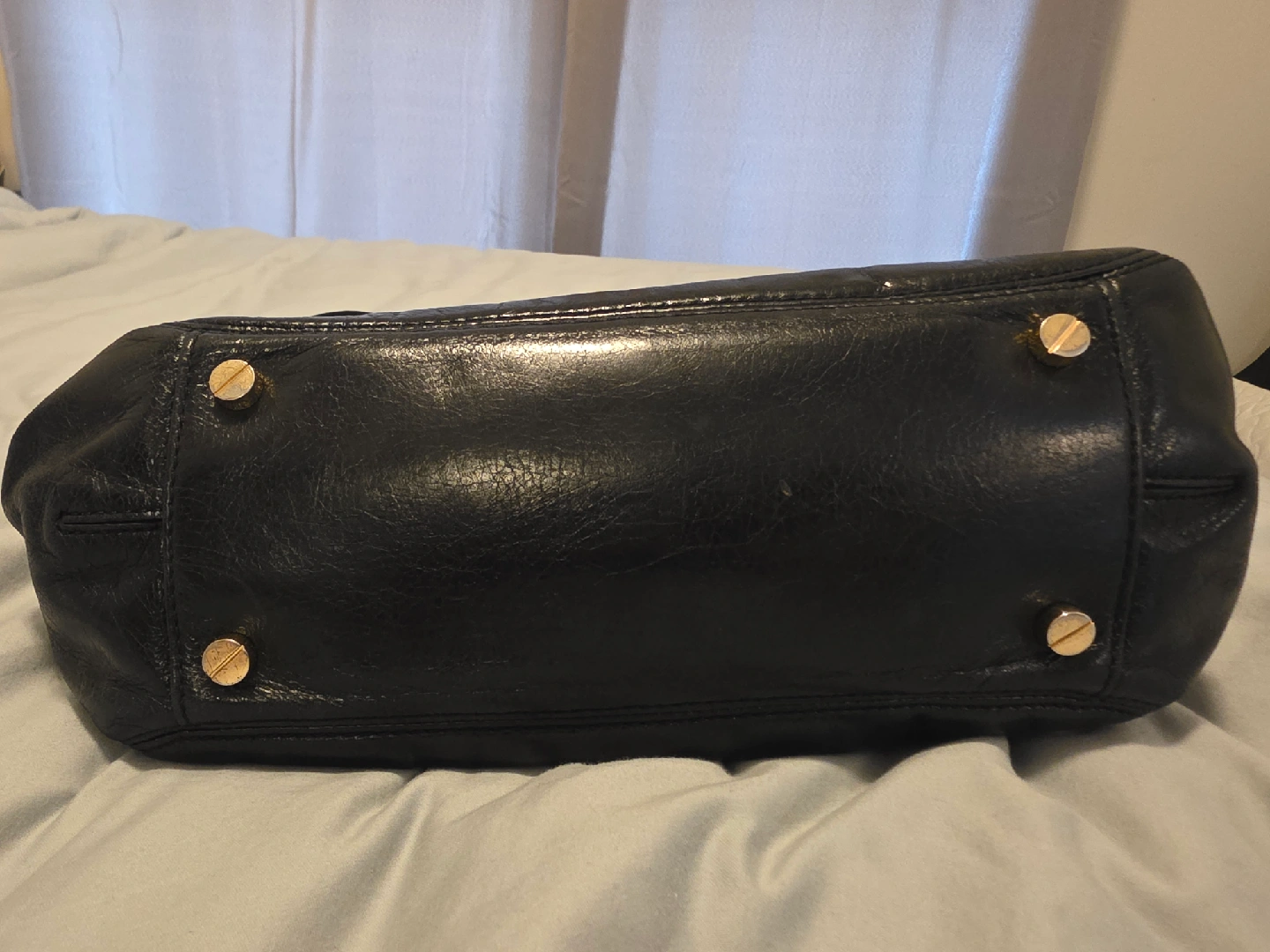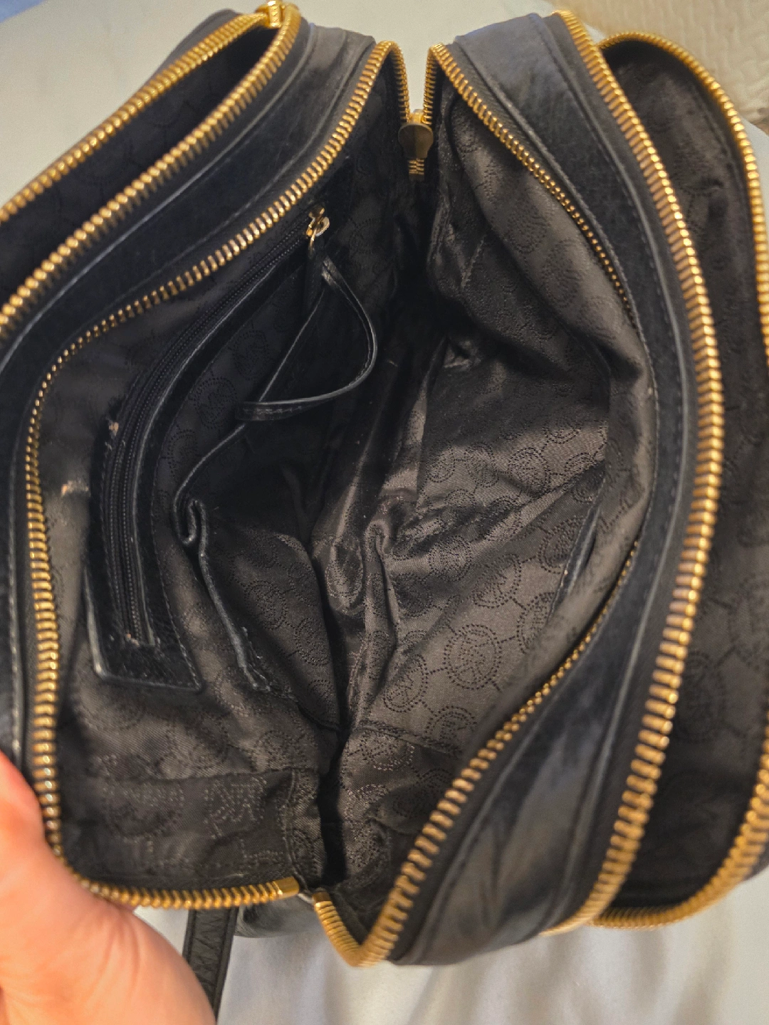 Selling a gently used Michael Kors black leather satchel. It has gold-tone hardware and a detachable shoulder strap. The interior has multiple compartments for organization. It's a stylish and practical bag for everyday use!