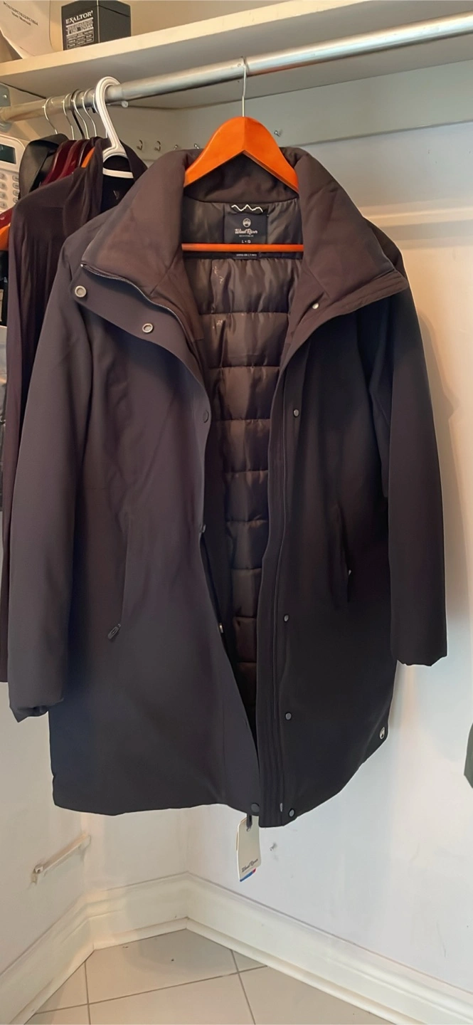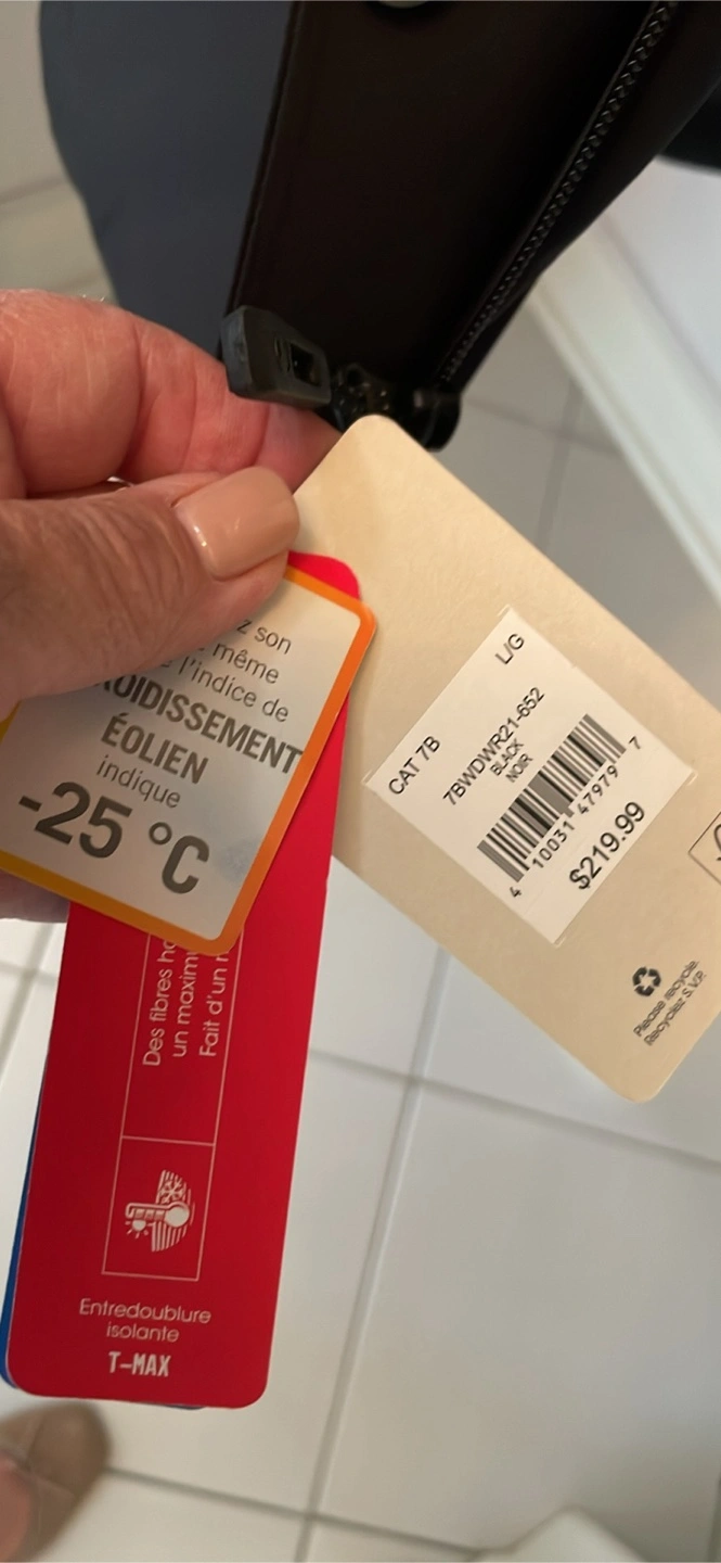 I have a brand new It's a size L and the colour is black. The tag shows it originally retailed for $219.99. This coat is rated for temperatures as low as -25°C, so it's perfect for the Canadian winter