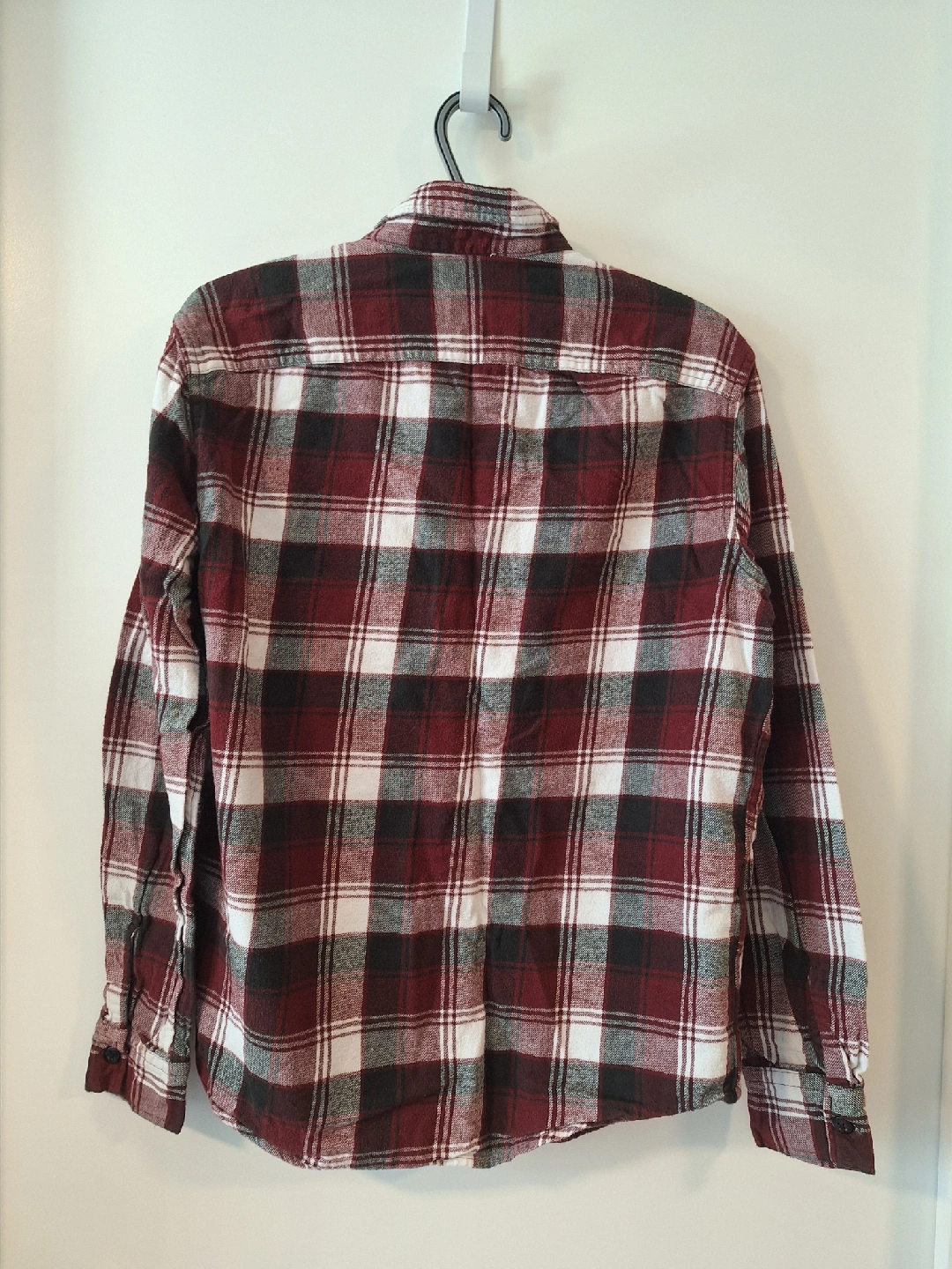 Cozy American Eagle flannel shirt in a classic plaid pattern! It's a size medium and made of comfortable material. Perfect for layering or wearing on its own.