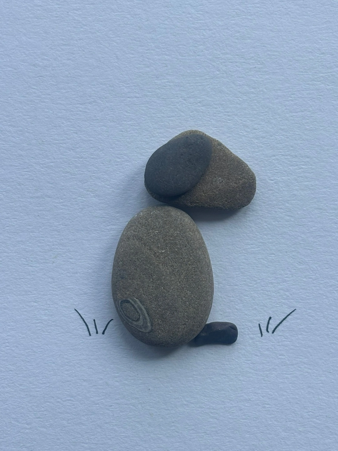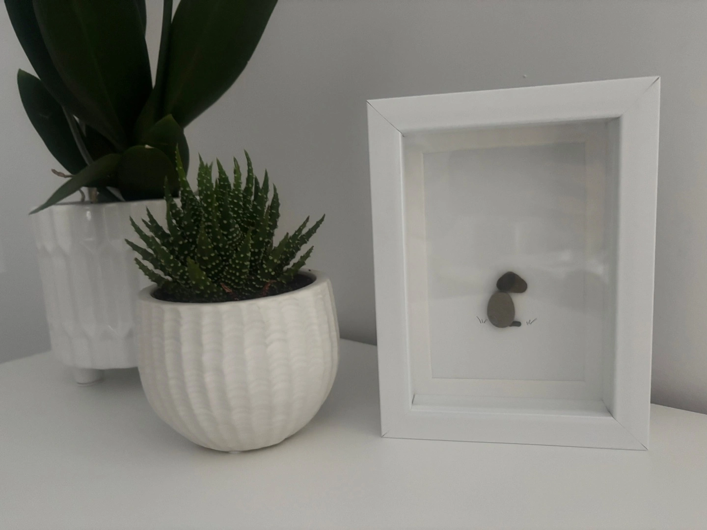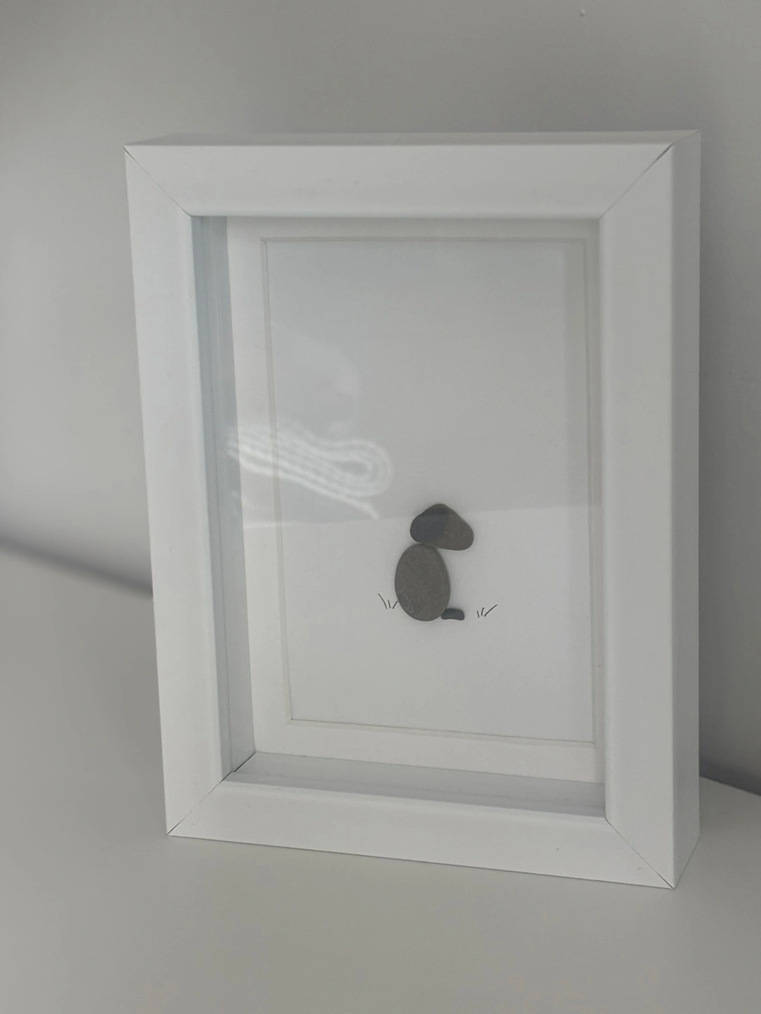 A cute piece of framed pebble art, perfect for adding a touch of whimsy to any room! The artwork features a dog made out of pebbles, set against a clean white background and framed in white. It's in great condition and ready to find a new home. 5” x 7” white shadow box