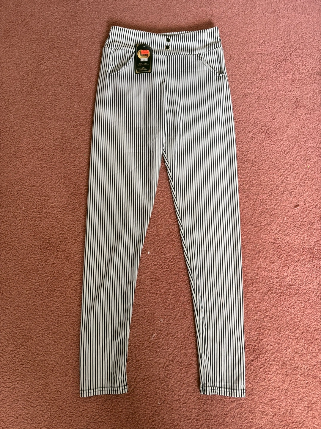 Selling a pair of Ruoy striped pants in size XL. They feature a classic black and white stripe pattern. Originally priced at $6.99, these pants are ready for a new home! Payment: Cash only Location: Rossland and Church or Durham College Oshawa