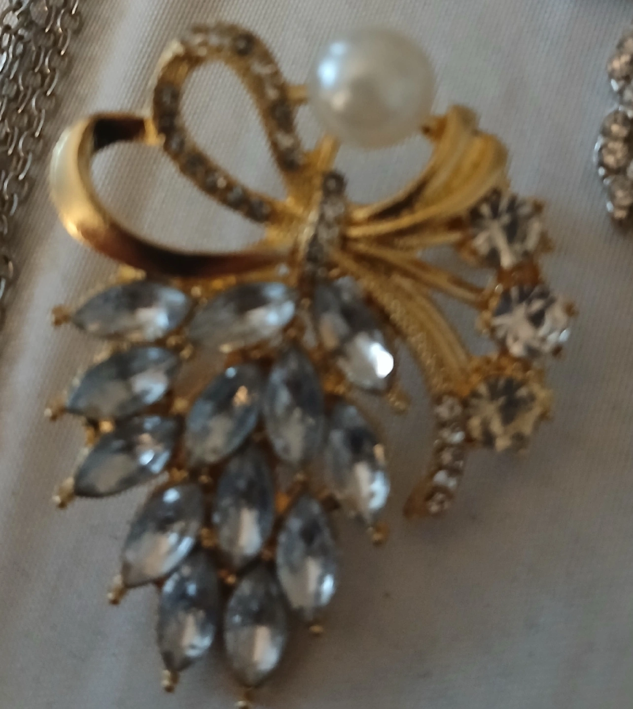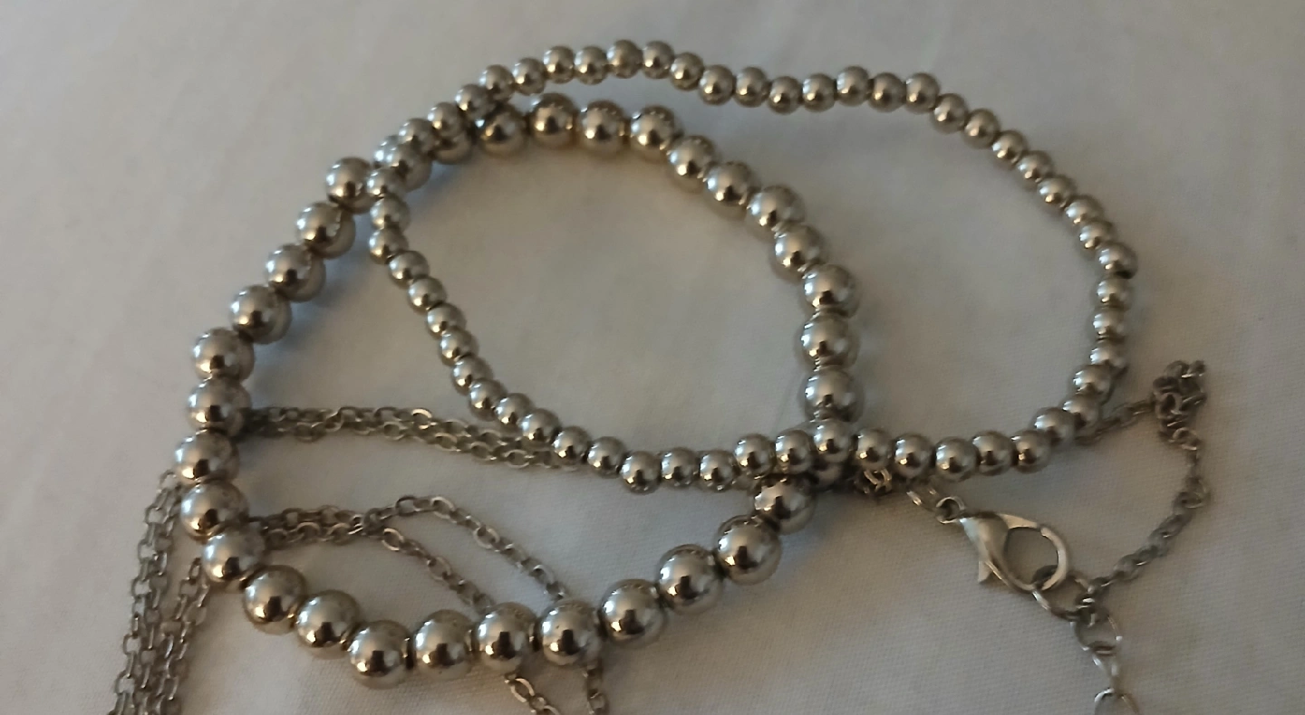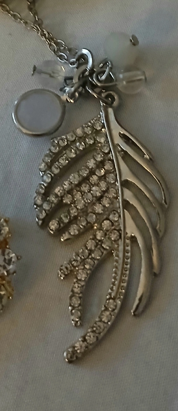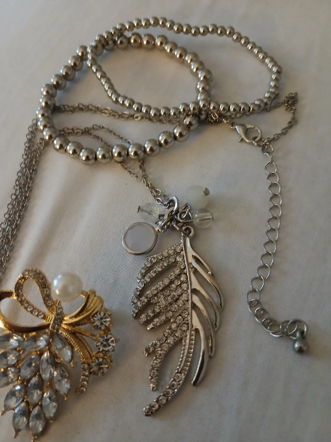 Selling a collection of costume jewellery. Includes a silver-toned leaf pendant necklace with rhinestones, a gold-toned brooch with a pearl and rhinestones, and a silver-toned beaded bracelets necklace is 26 imches can be made smaller