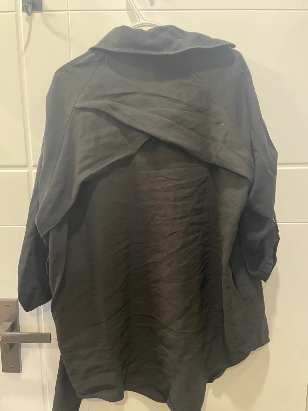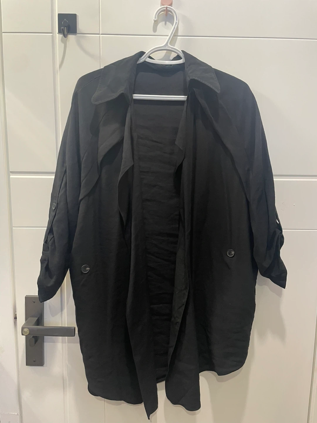 Selling a stylish black trench coat! It's in great condition and perfect for layering. The material feels nice and lightweight, making it a comfortable choice for different weather conditions. A versatile addition to any wardrobe!