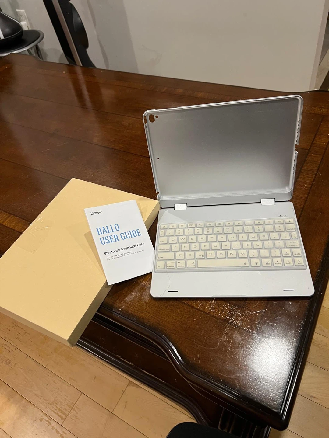 Selling an iEGrow Hallo Bluetooth Keyboard Case. It's compatible with the iPad 6th generation, iPad 5th generation, iPad Pro 9.7, iPad Air 2, and iPad Air. The keyboard case is silver and comes with the user guide and the original box!
