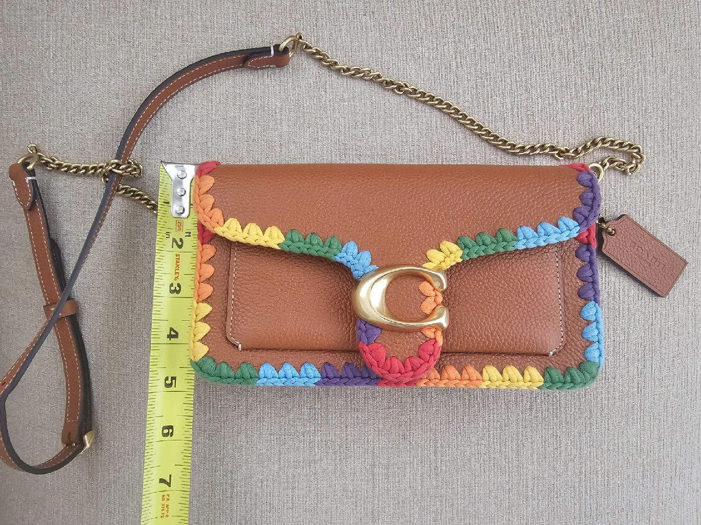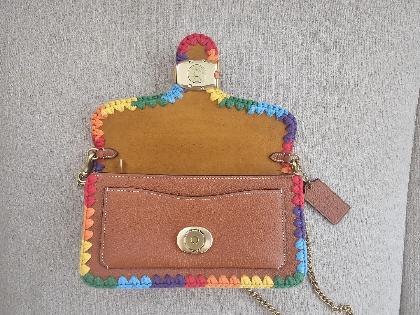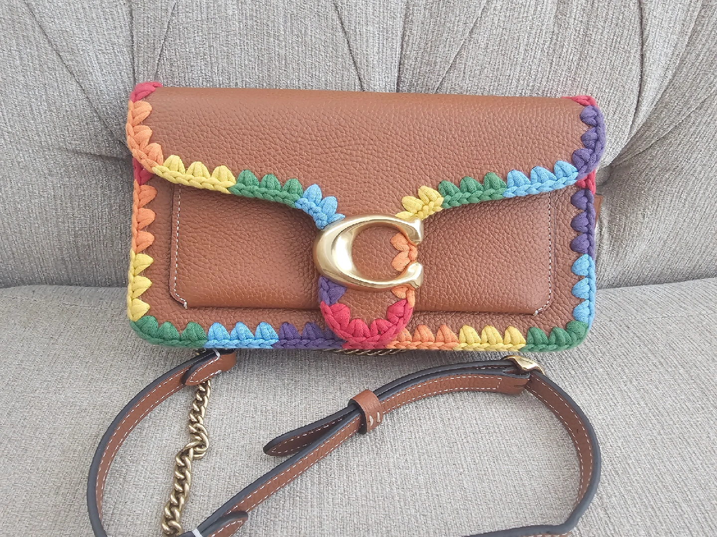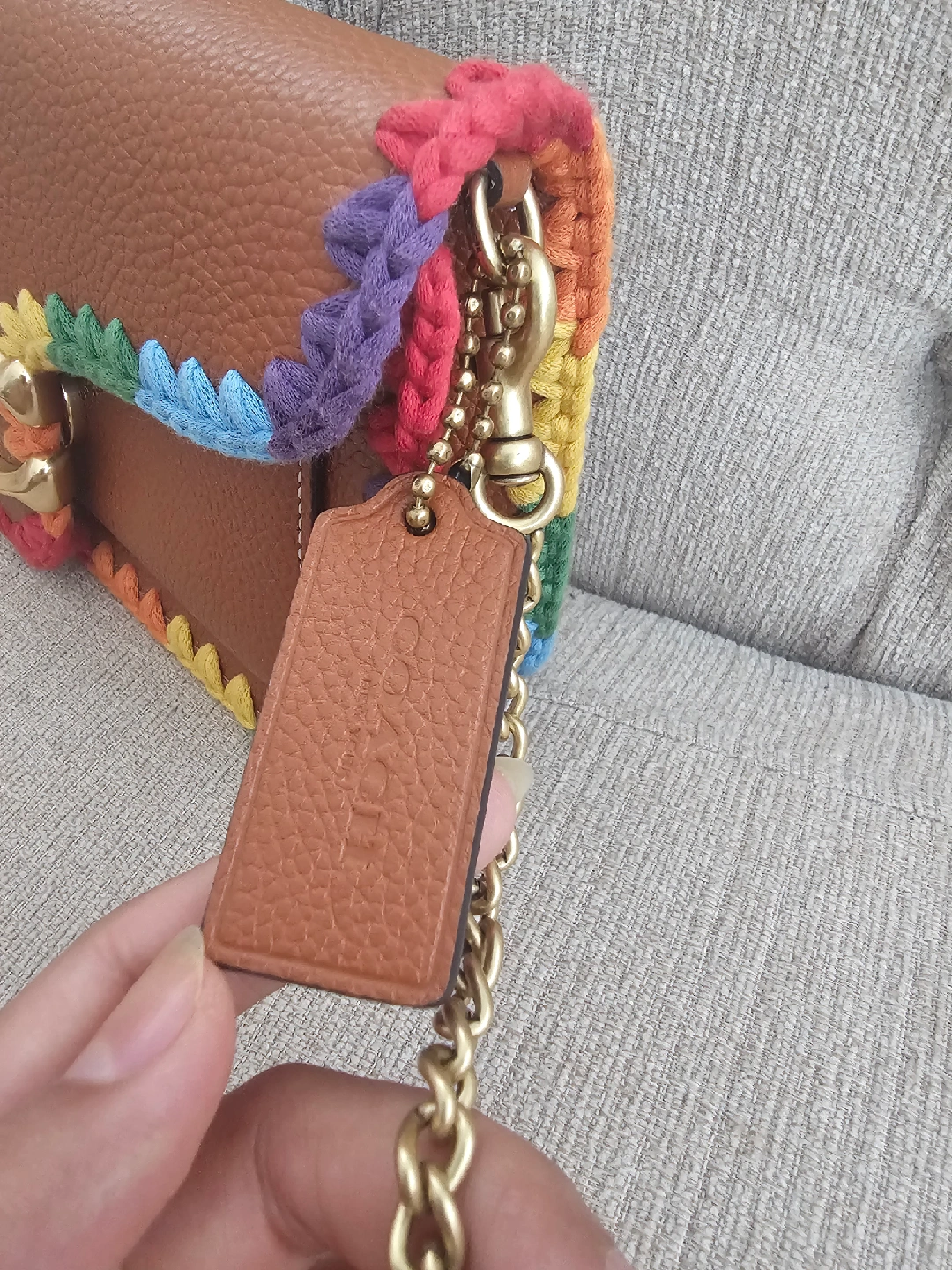 Selling a Coach Tabby bag with unique rainbow crochet detailing! The bag is in great condition and features the classic Coach 'C' logo. It's a stylish and fun piece to add to your collection!