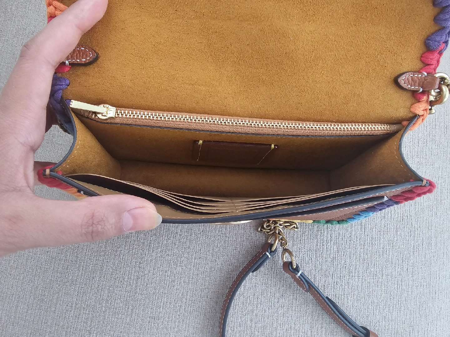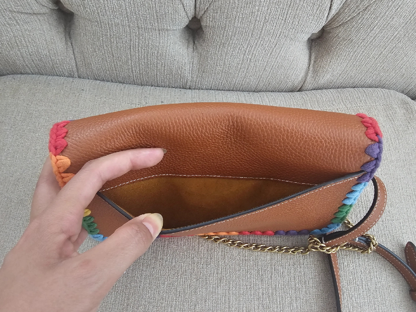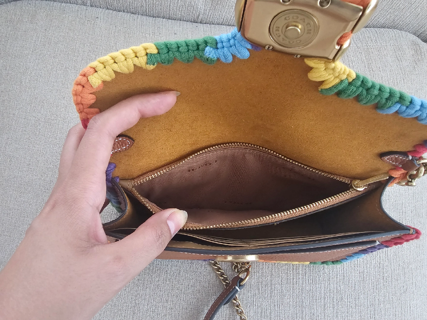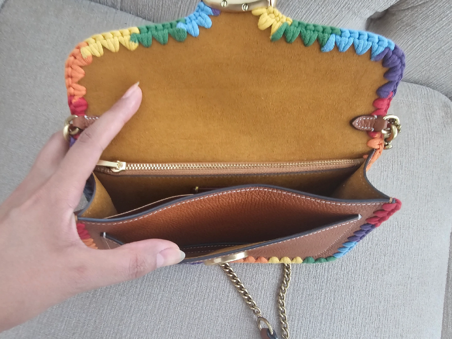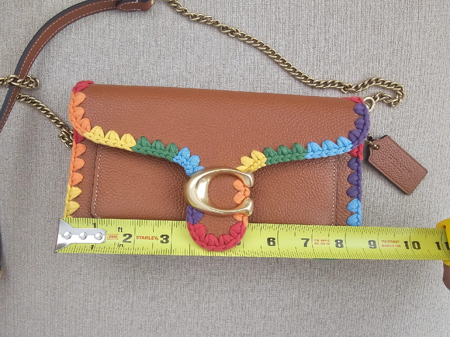 Selling a Coach Tabby bag with unique rainbow crochet detailing! The bag is in great condition and features the classic Coach 'C' logo. It's a stylish and fun piece to add to your collection!