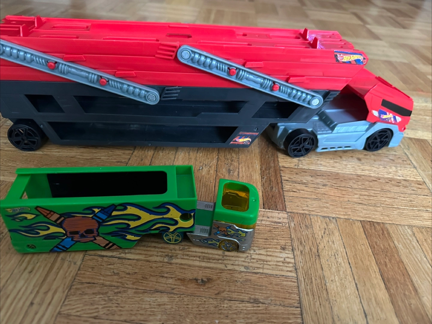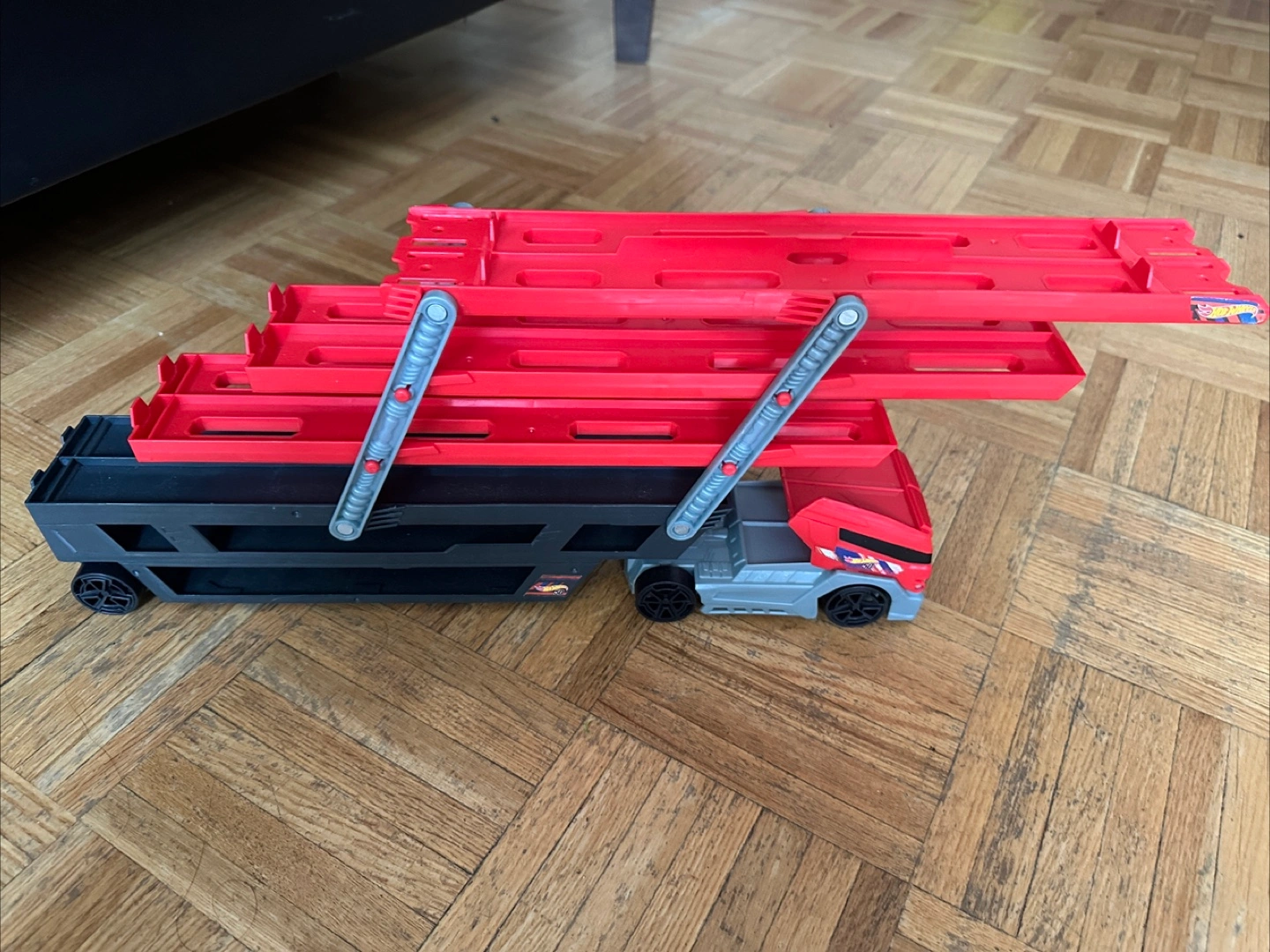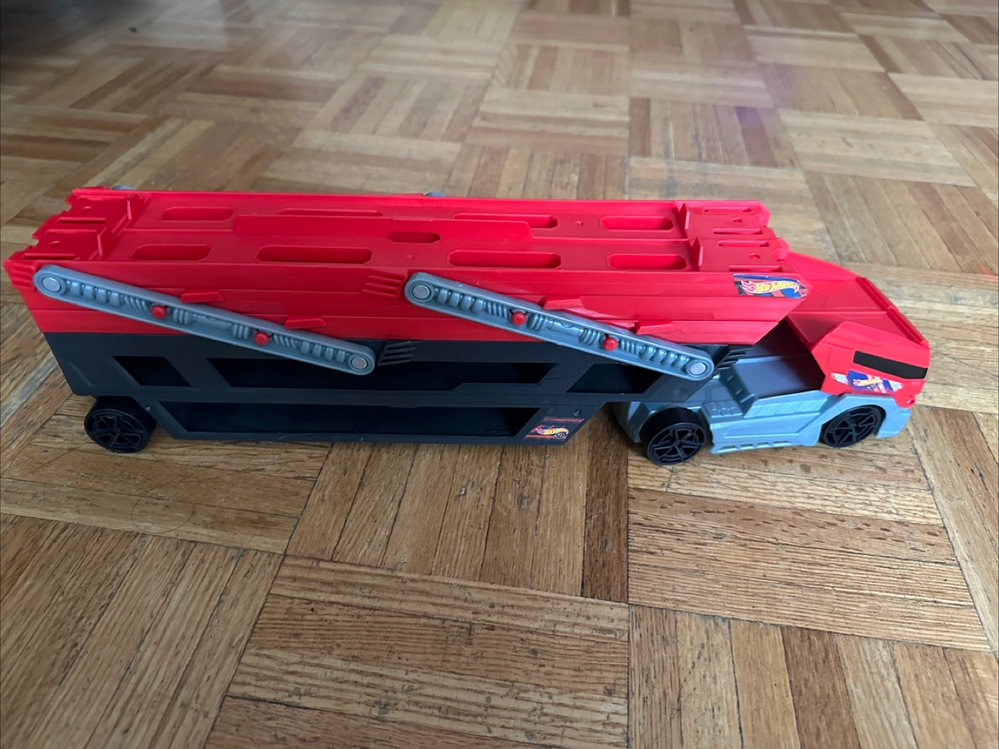 Give away!! Hot Wheels Mega Hauler truck and a green car. The hauler is red, black, and grey. Great for any Hot Wheels fan!