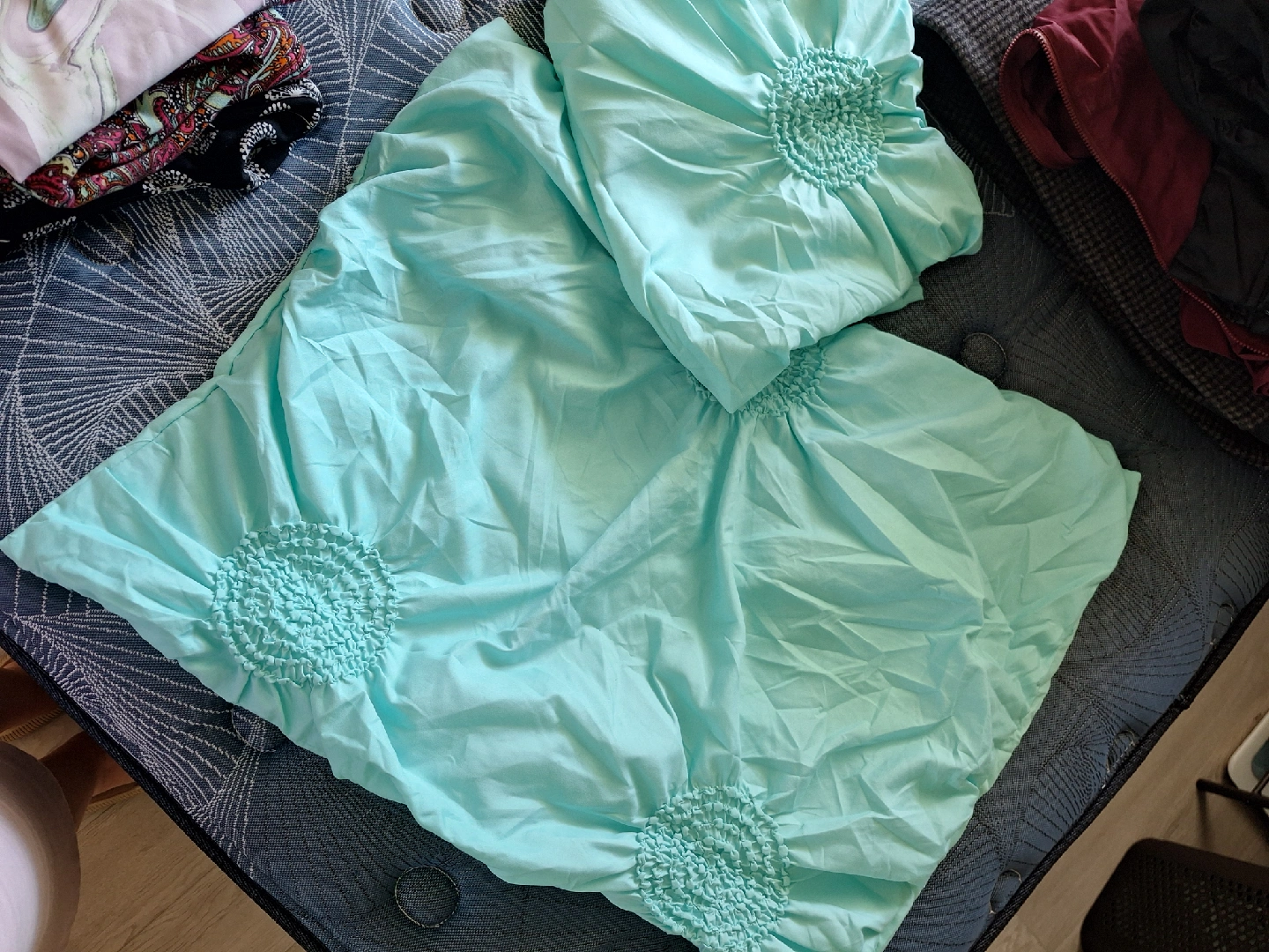 Giving away a light blue set of pillow shams. It includes a fitted sheet and pillowcase. The set has a unique smocked design. Perfect for adding a pop of colour to your bedroom.