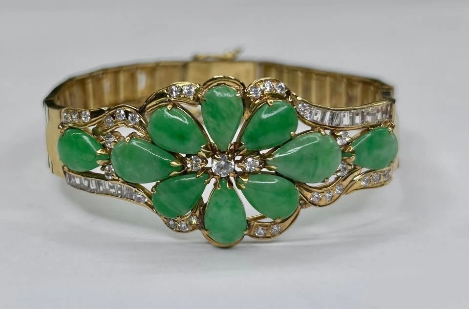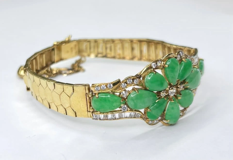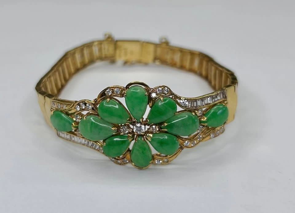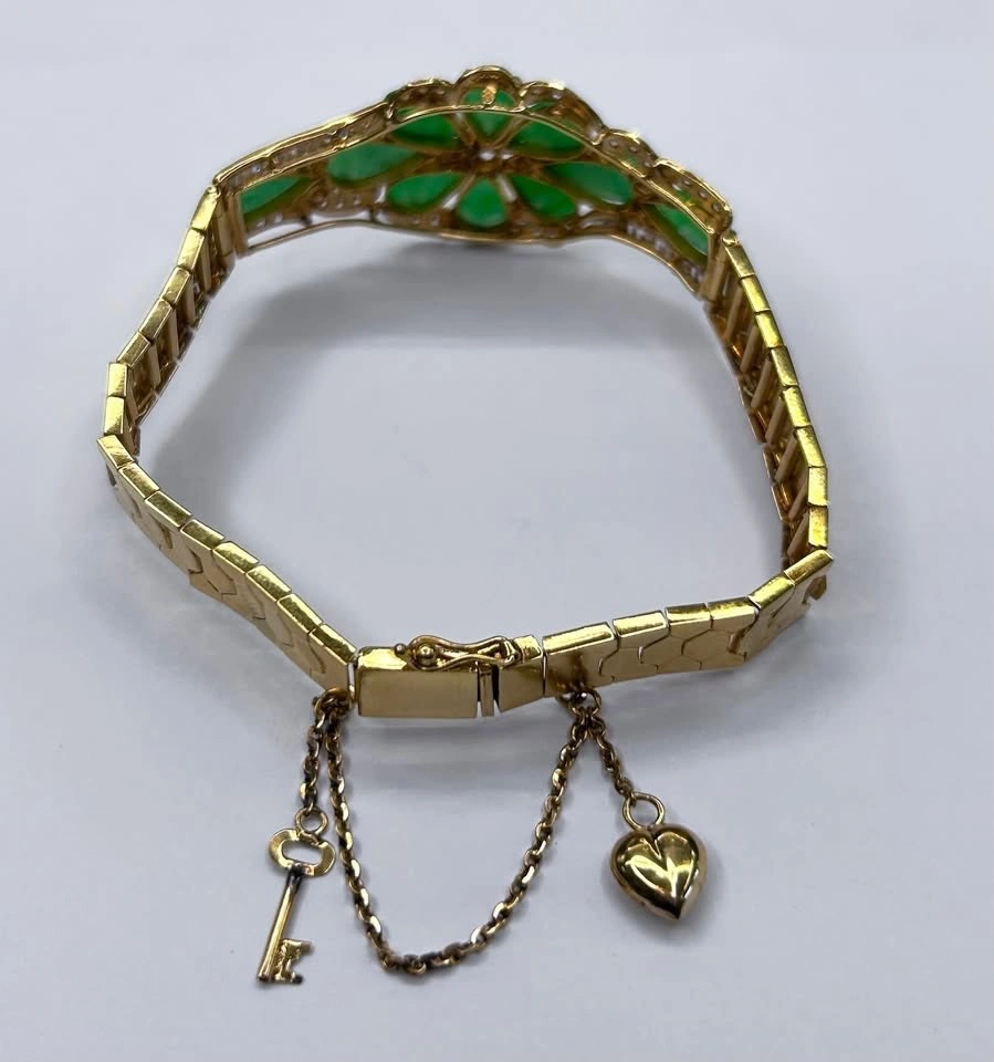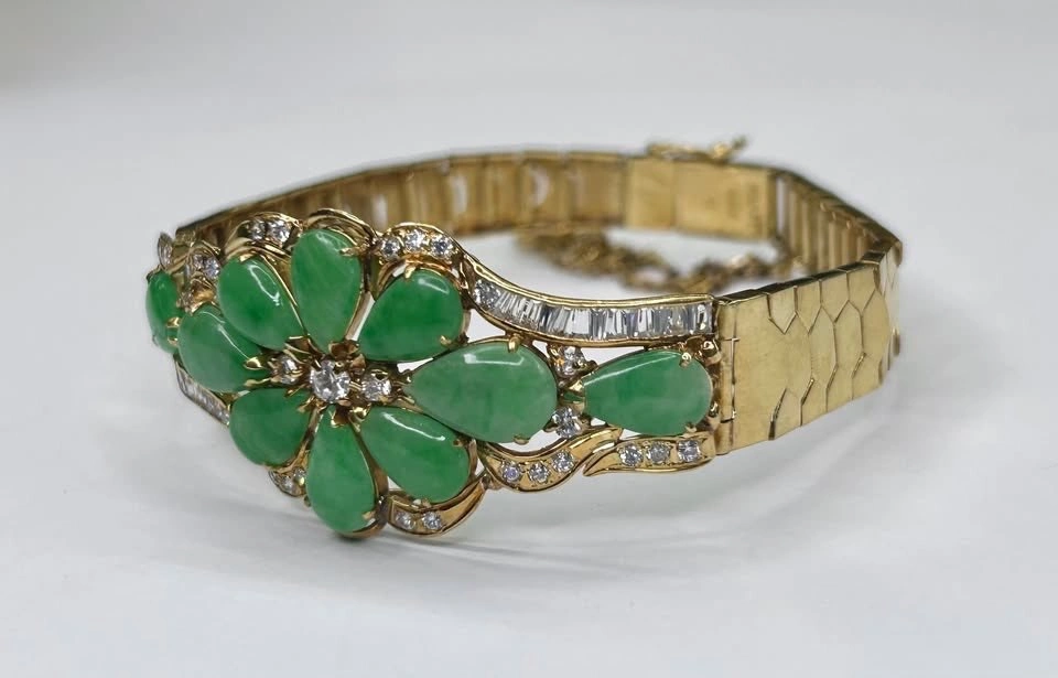 18K Yellow Gold Bracelet With Jades & Cubic Zirconias Comes as seen in photos $2,800 Available at 4 Seasons Pawn Shop & Gold Buyer (Newton Location) 7155 King George Blvd Surrey, BC Canada We are open 9:30 am - 6:00 pm Monday - Saturday and 11:00 am - 6:00 pm on Sundays. For more information visit our shop or give us a call at 6O4-592-O223 We accept multiple forms of payment including cash, e transfer, debit, visa, Mastercard, American Express, certified bank. We also have an interest free layaway plan available, ask us for more information. Thank you for your interest in our products. #1016739