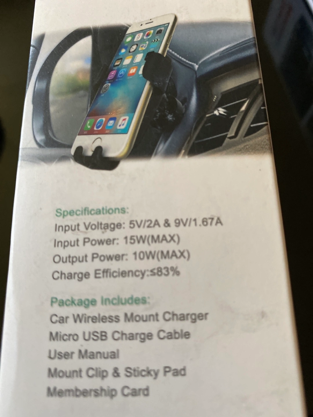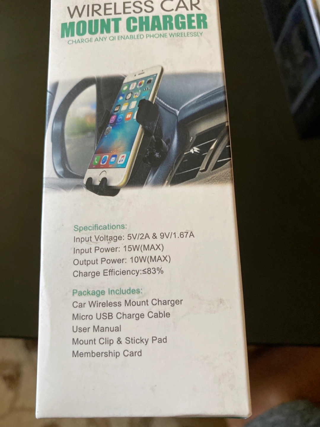 Selling a brand new Wireless Car Mount Charger! It's still in its original packaging and has never been used. It features: - Overcharge protection - Secure grip pads - High-speed charging with a built-in coil and 10W output The package includes the car wireless mount charger, a micro USB charge cable, a user manual, a mount clip and sticky pad, and a membership card