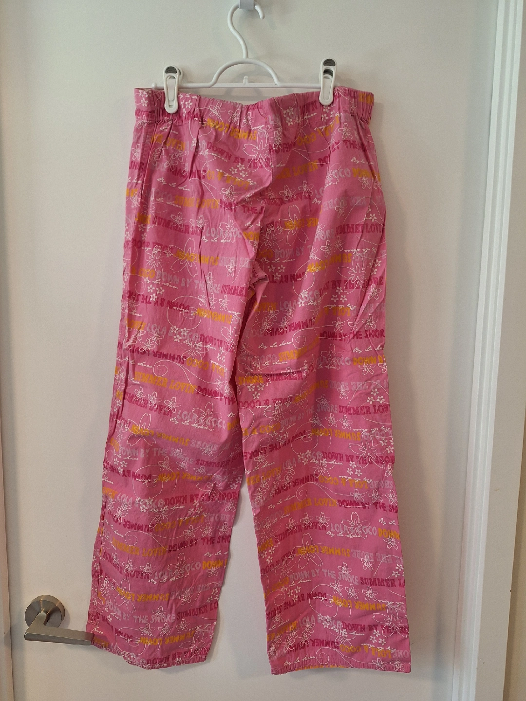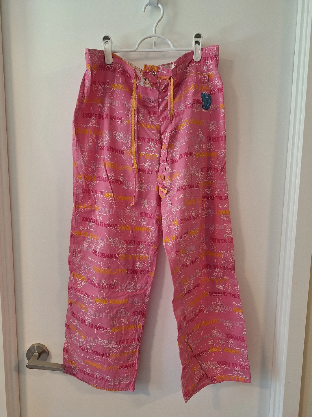 These La Senza pajama pants are perfect for summer! They feature a fun pink print with summery words and floral designs. The size is M. Great for lounging or casual wear!