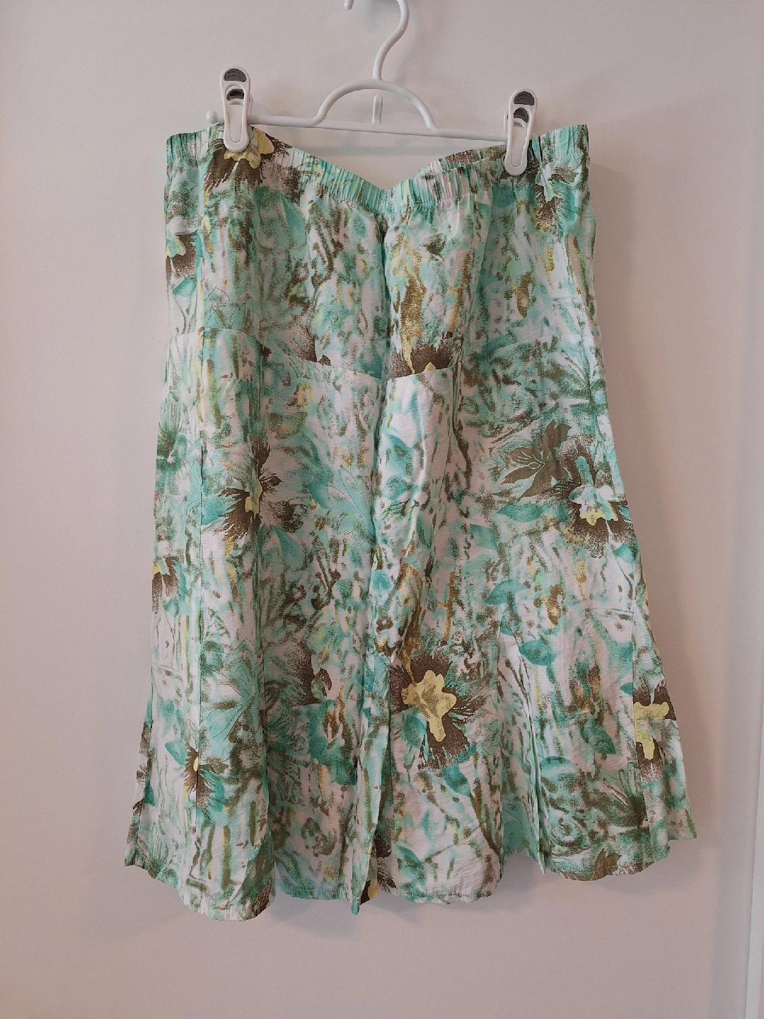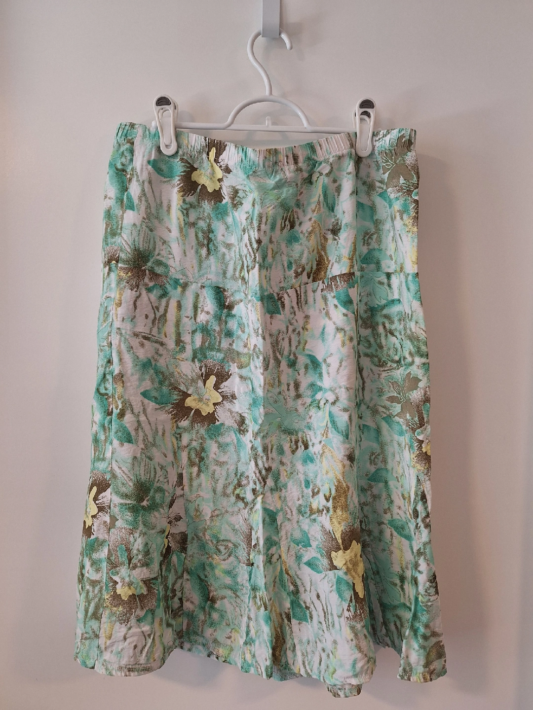 Here's a lovely floral skirt in a mix of green, white, and brown tones! It would be a great addition to your wardrobe for a fresh, summery look.