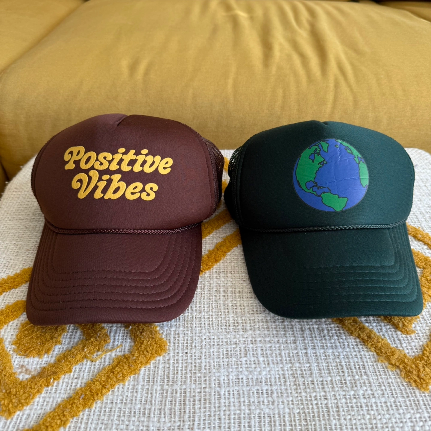 Selling a brown trucker hat with 'Positive Vibes' printed on the front. It's in great shape and ready for a new home! Also selling a green earth trucker hat. BOTH FOR $20 OR BROWN- $15 GREEN- $10 🍁FALL CLEAR OUT ** if listing is still up the item is available ALL SALES FINAL SERIOUS INQUIRES ONLY PLEASE :) PICKUP ONLY - PRIORITY TO QUICK PICKUP AND/OR BUNDLES LOCATION: DOWNTOWN ( RICHMOND/ GEORGE ST) Check my listings for more and follow for new items almost DAILY😀!!!
