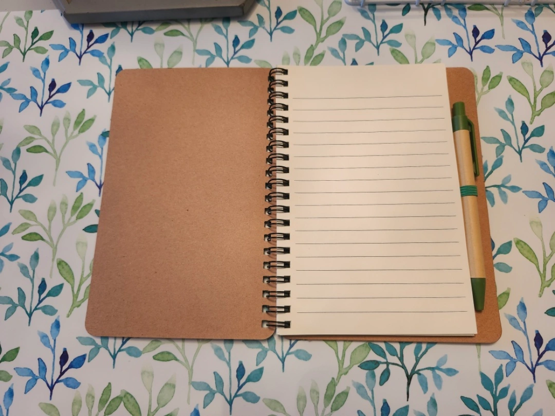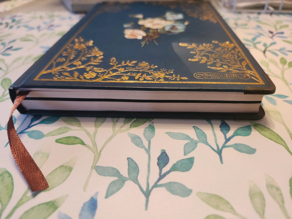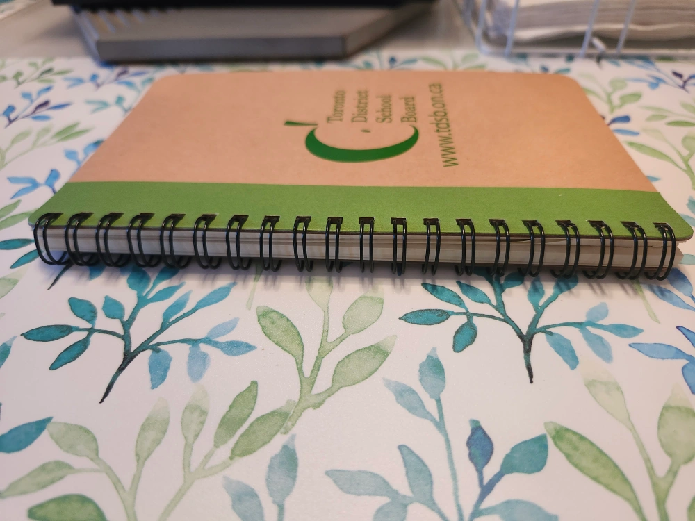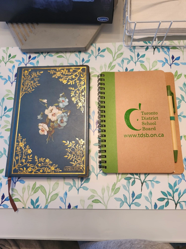 Two notebooks, selling together for $5. Blue Studio notebook with a floral design, flowers, a gold boarder, a bookmark, and black and beige pages. Toronto District School Board mini note book. Green, Brown, ringed, and comes with a matching pen.
