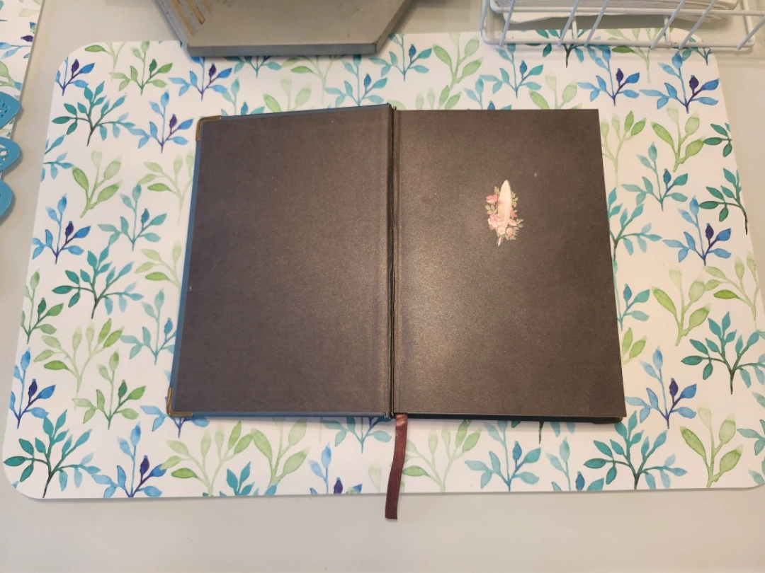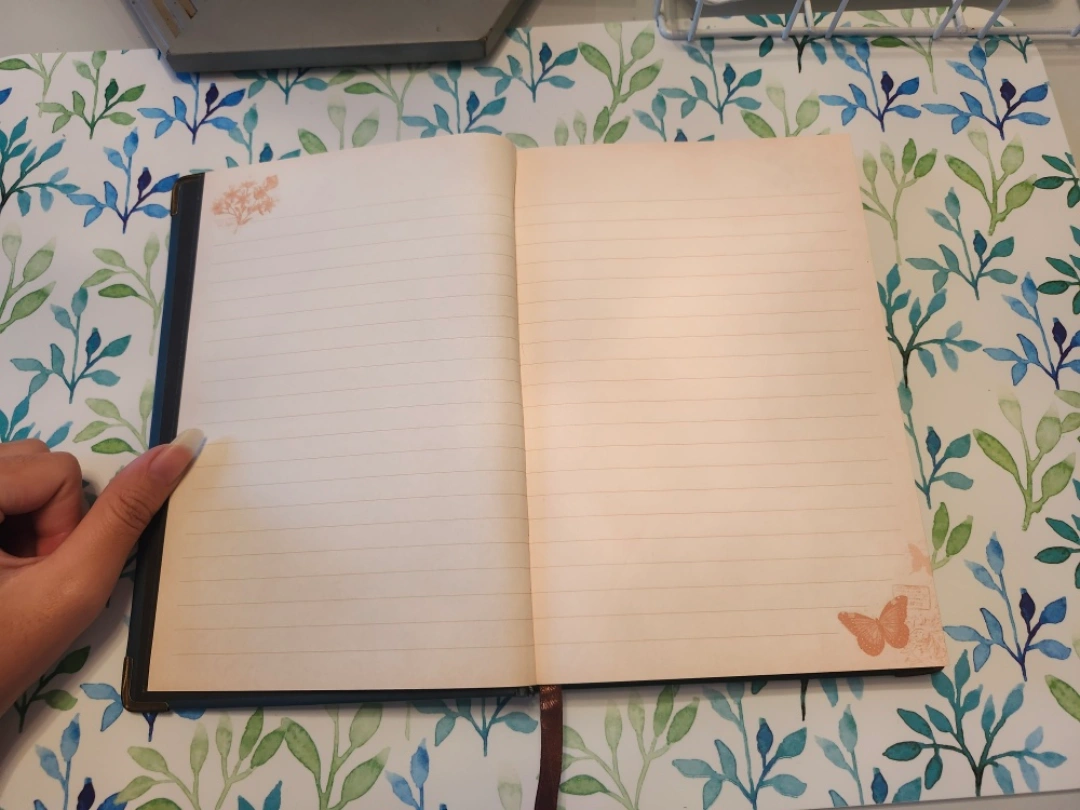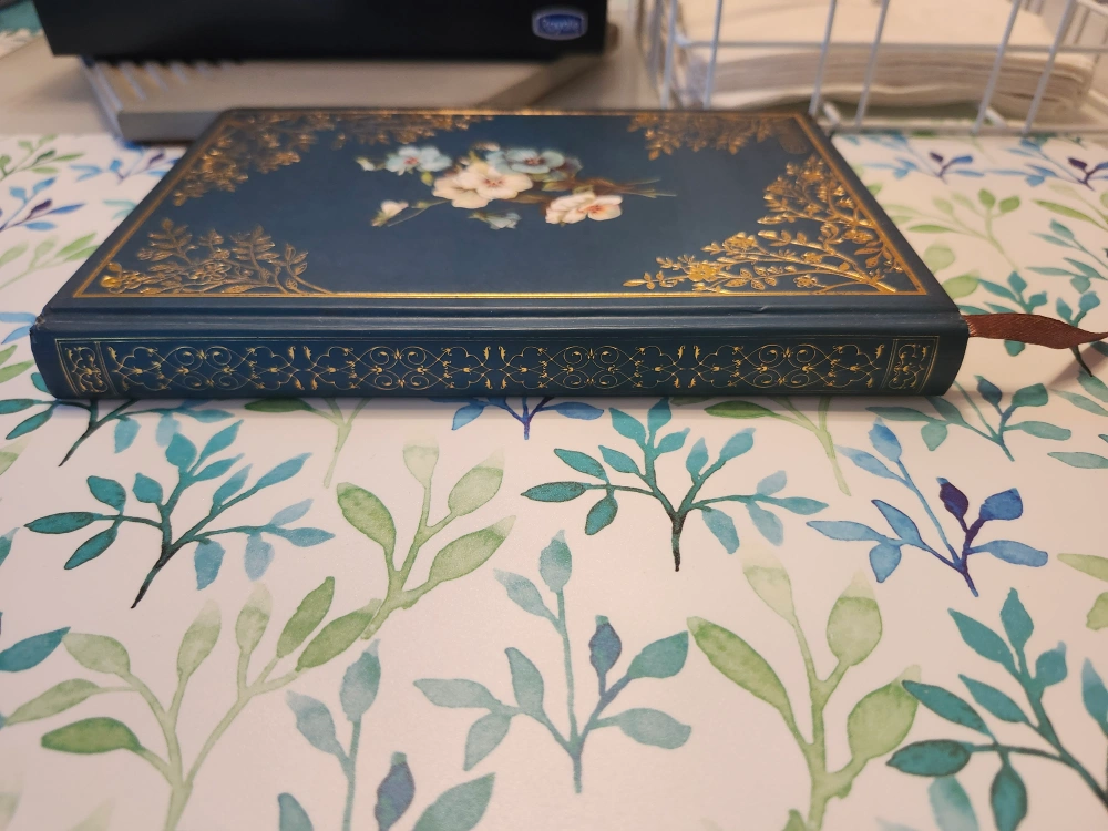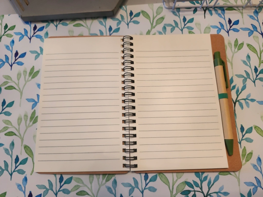 Two notebooks, selling together for $5. Blue Studio notebook with a floral design, flowers, a gold boarder, a bookmark, and black and beige pages. Toronto District School Board mini note book. Green, Brown, ringed, and comes with a matching pen.