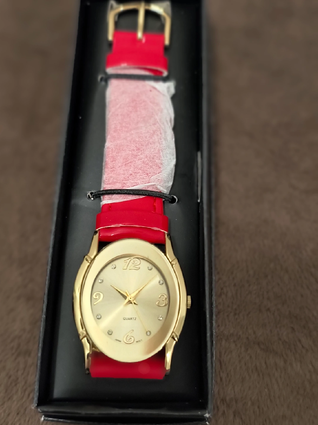 Selling a brand new, never worn gold-tone watch! It features a vibrant red strap and comes complete with its original box. A stylish and eye-catching piece to add to your collection!