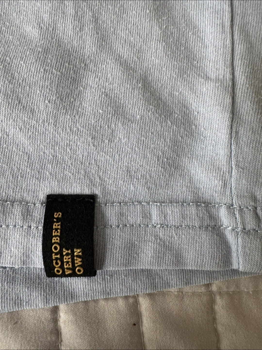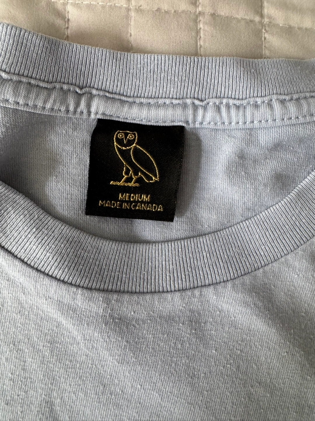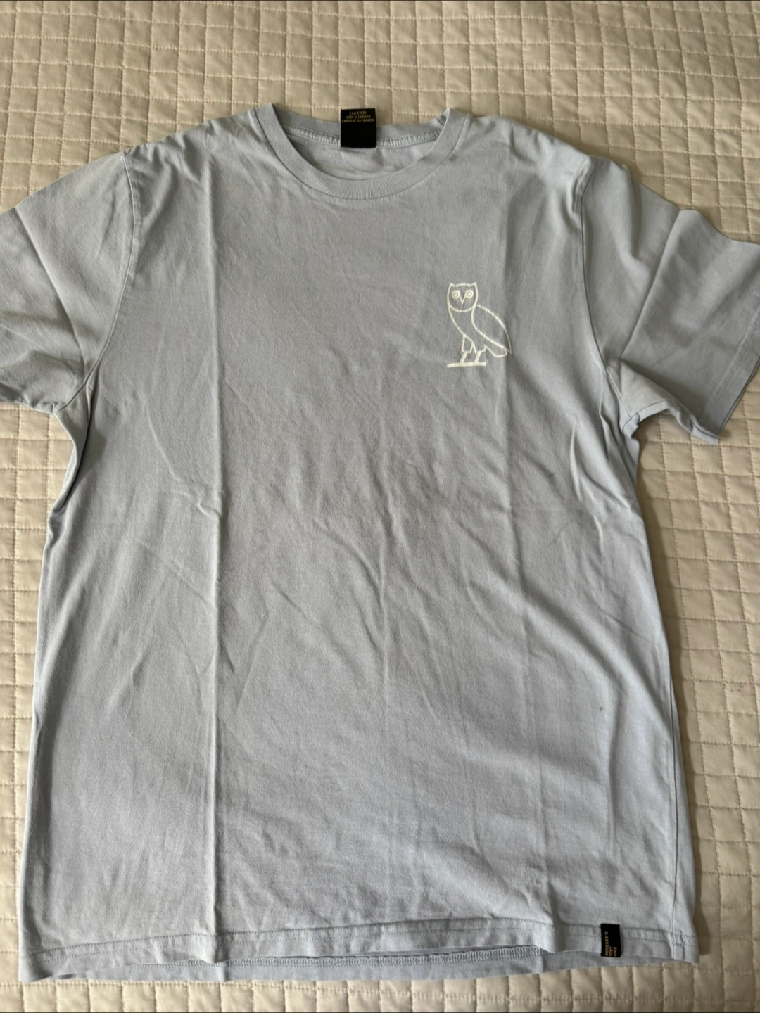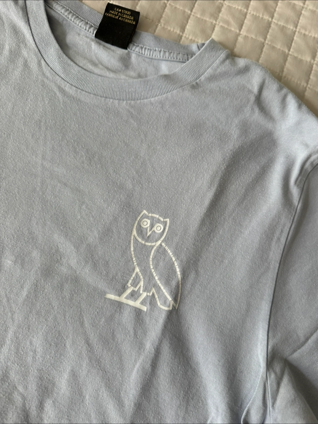 Selling a gently used October's Very Own (OVO) t-shirt in size medium. It's a light blue colour with the OVO owl logo on the front and a unique design on the back. Made in Canada!