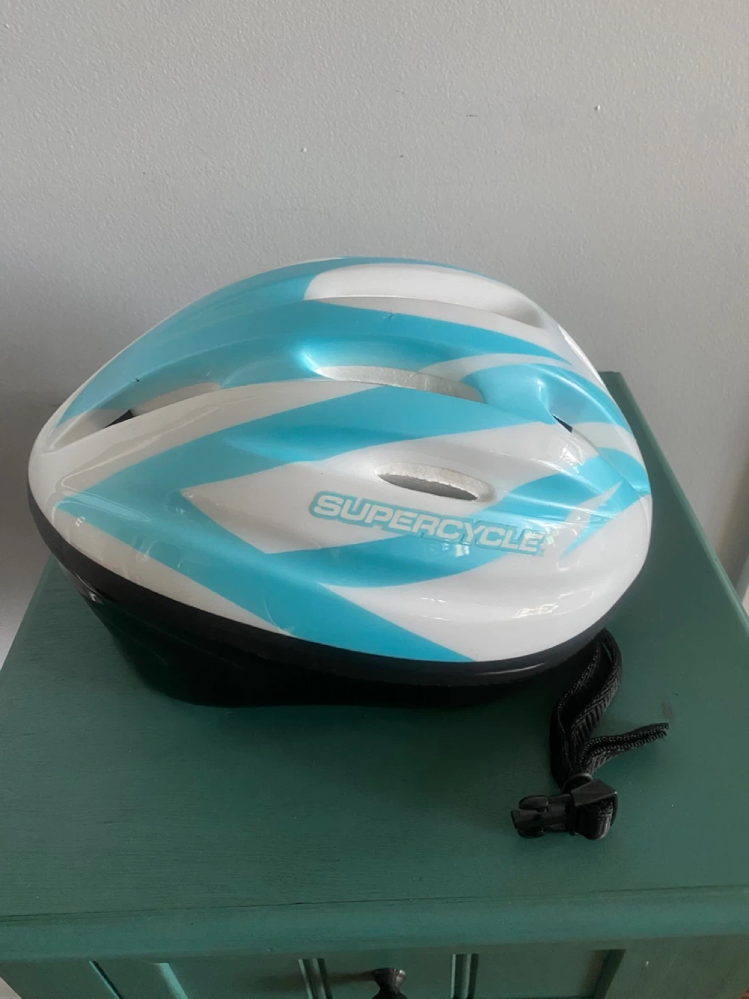 Teen Supercycle bike helmet in like new condition! Worn only twice. It's white with blue accents and ready for your next ride around town or on the trails