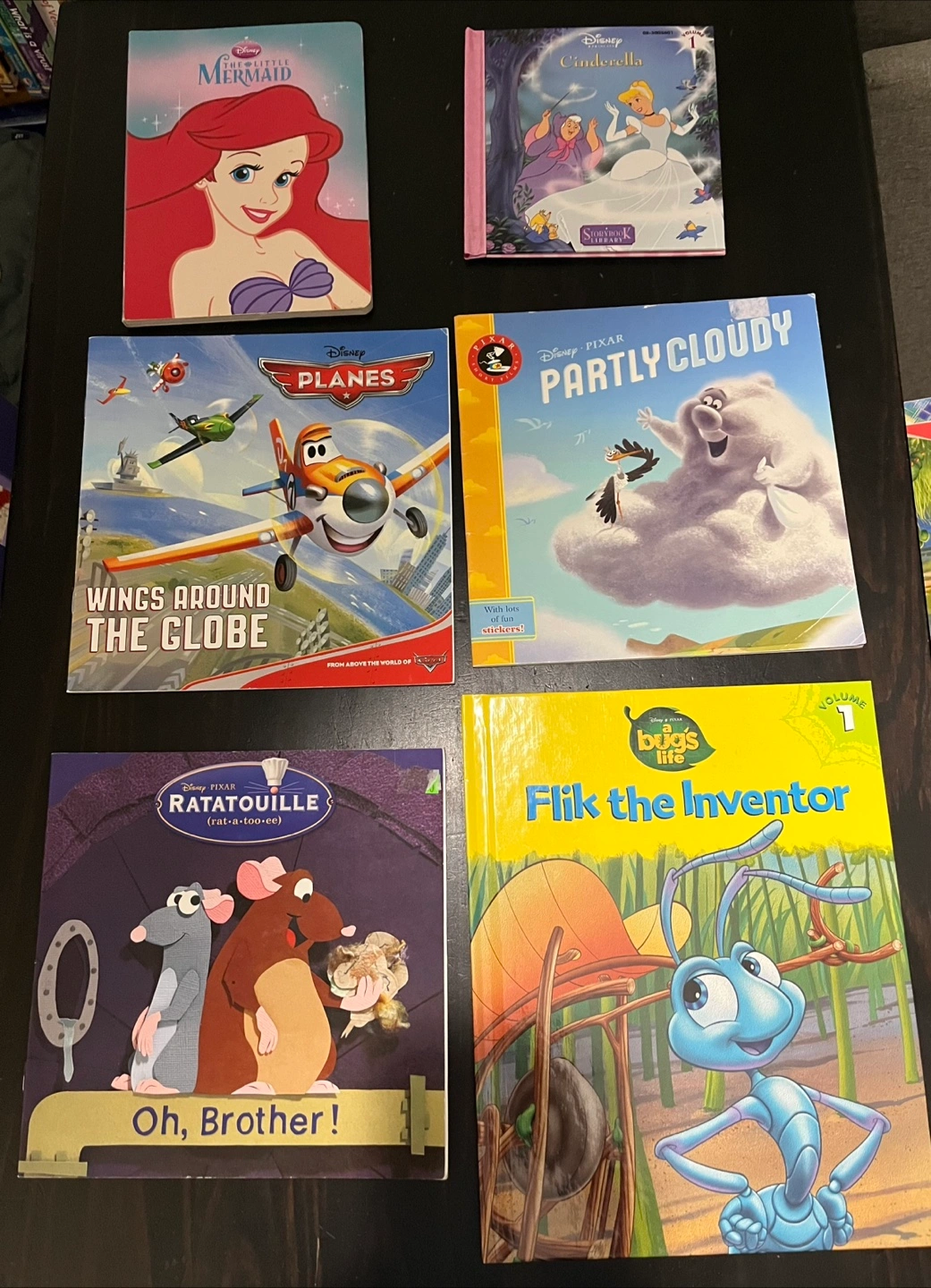 Selling a collection of Disney Pixar children's books! Includes titles like The Little Mermaid, Cinderella, Planes: Wings Around the Globe, Partly Cloudy, Ratatouille: Oh, Brother!, and A Bug's Life: Flik the Inventor