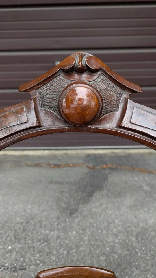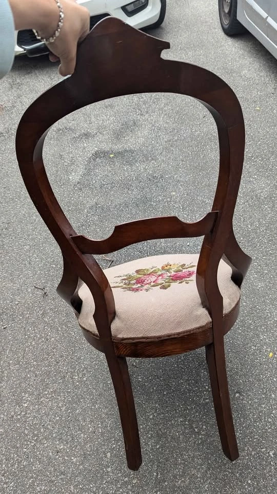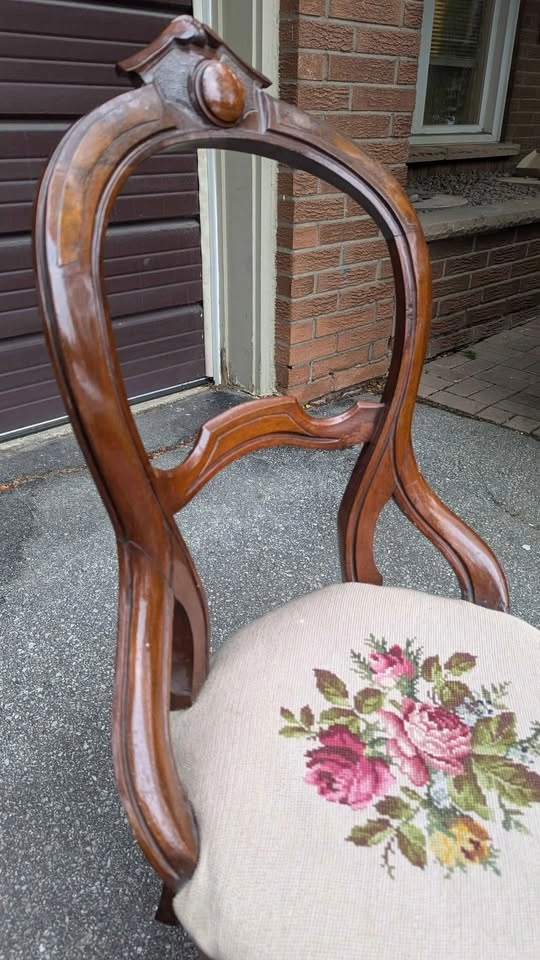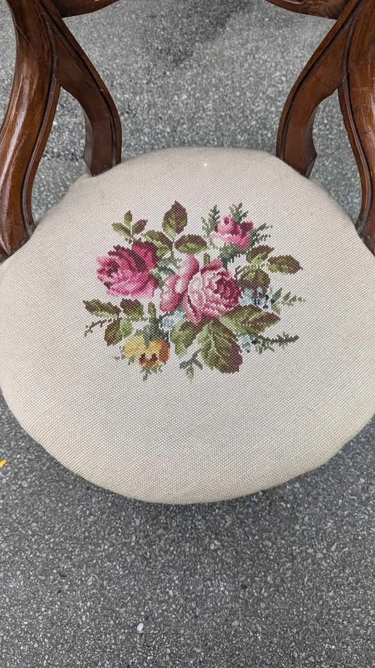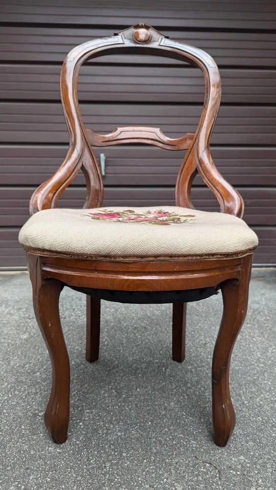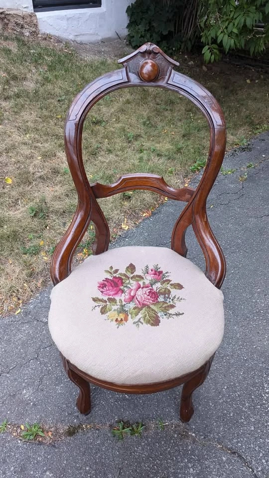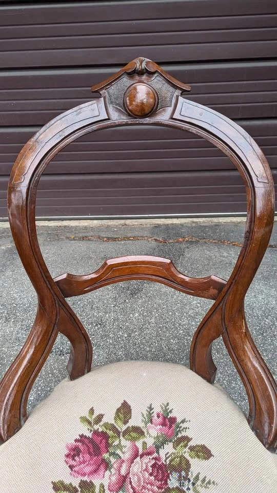 Beautiful late 19th century balloon-back chair featuring mahogany finish carved backrest and crest rail, paired with a hand-stitched floral needlepoint seat. The craftsmanship shows off the elegant curves and Victorian charm that make this style so timeless. Overall solid and sturdy, has some creaking, cushion has some give, expected age-related wear that adds to the character. Floral seat covering is clean and in good vintage condition. Perfect as an accent chair, decorative display only or gentle use. Approx. 38" total height, seat is 16" from ground.