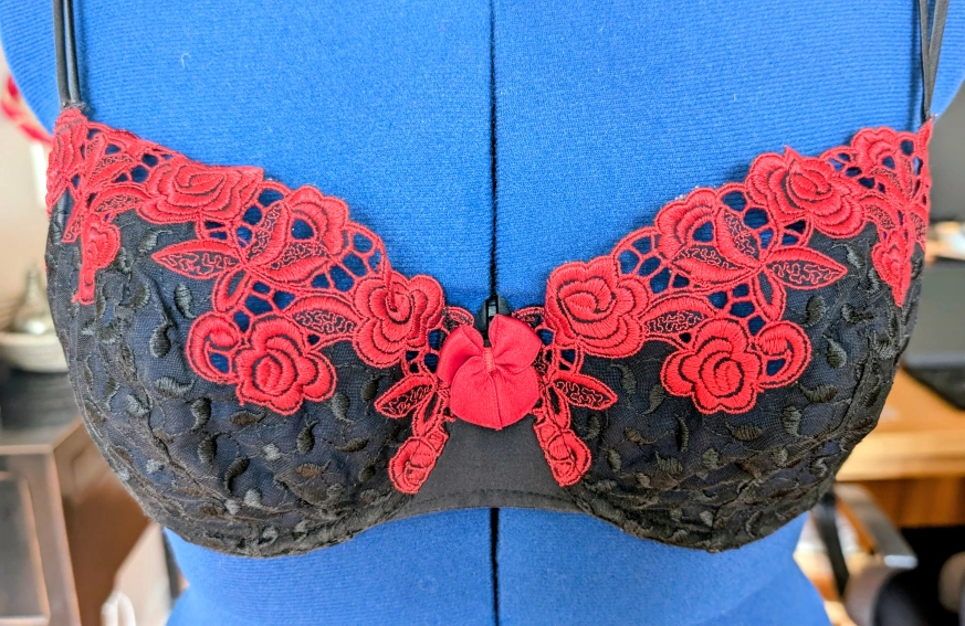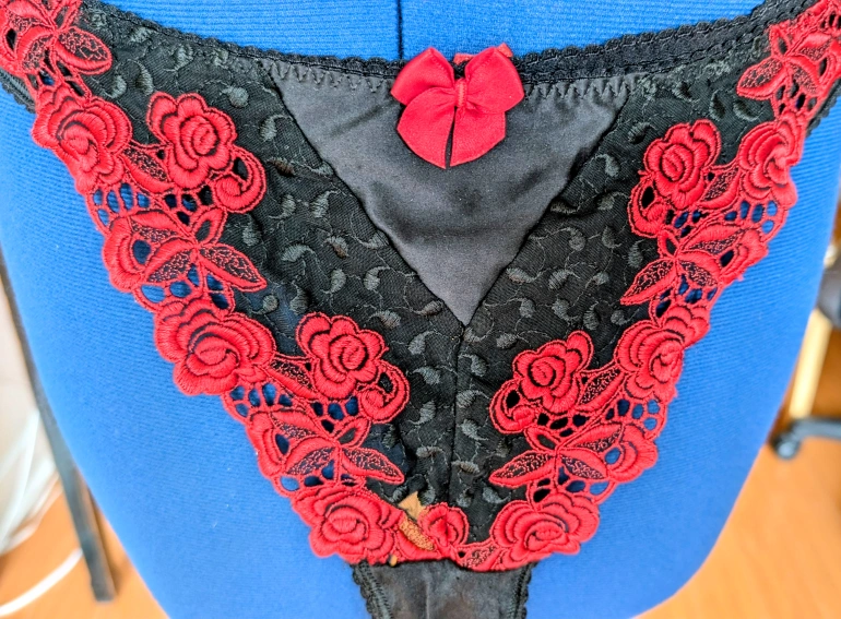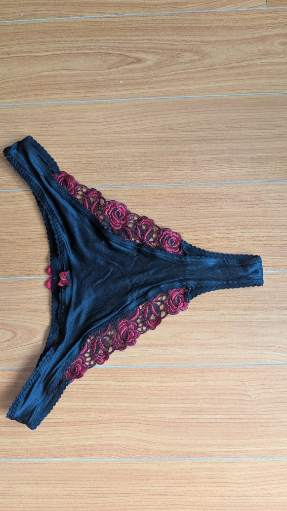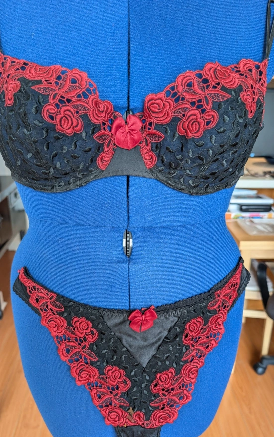 Selling a cute lingerie set featuring a black base with red floral lace detailing. The set includes a bra and matching thong. The size is marked as 38C on the tag. Perfect for adding a little something special to your wardrobe!