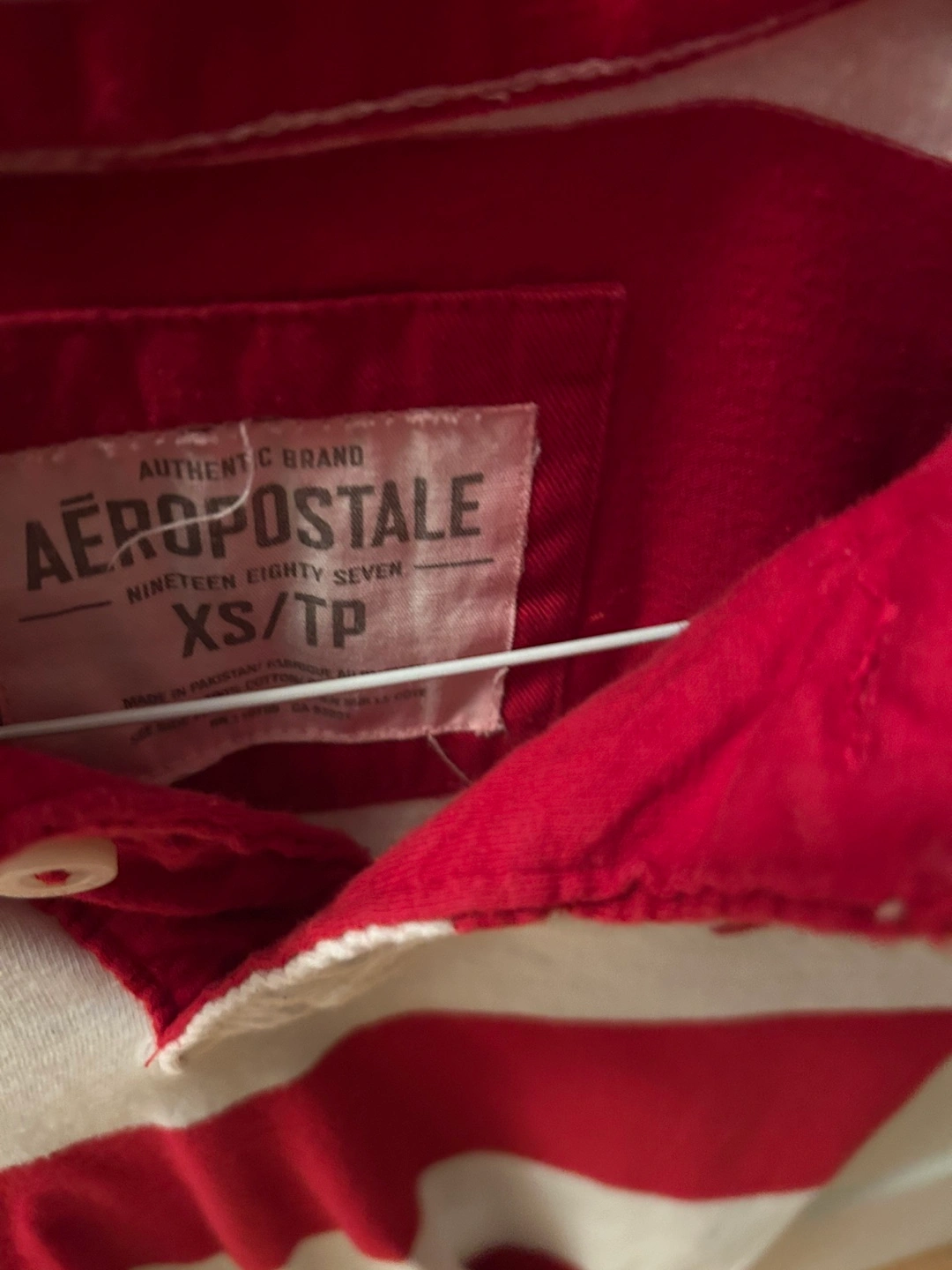 Selling an Aeropostale polo shirt in size XS/TP. It features a classic red and white striped design. The polo has short sleeves and a button-up collar. It's in good condition and ready for a new home!