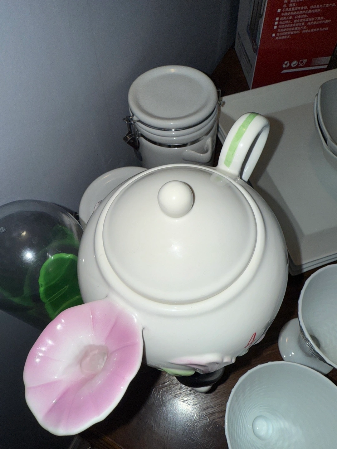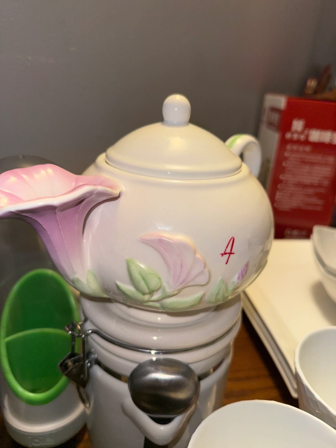Selling a cute floral tea pot! It has a unique design with a flower on the side. Perfect for tea parties or adding a touch of whimsy to your kitchen