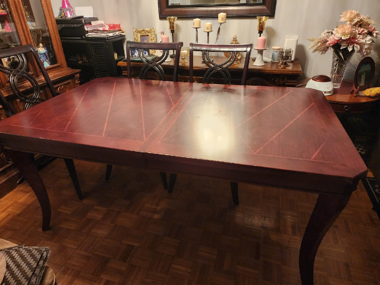 Table is 6 feet long, 3.5 feet wide, 2.5 feet high Comes with 6 chairs (2 have armrests, and 4 without) Is solid wood. In really good condition, but does have some scratches and one part on the side with a piece that broke off. You must be able to pick up.