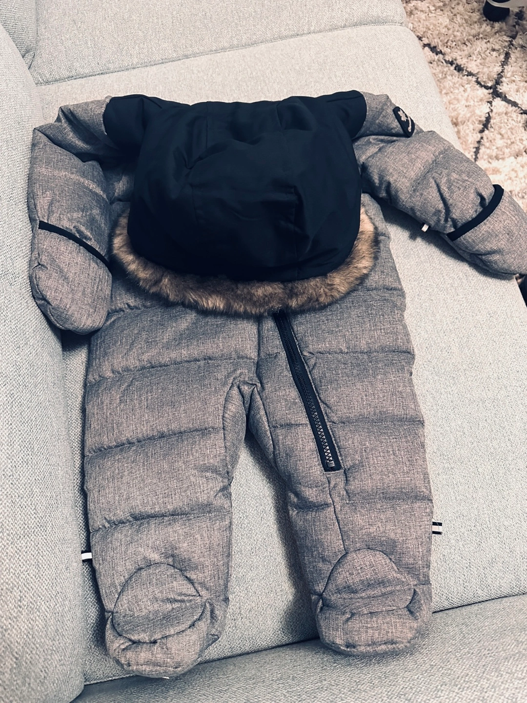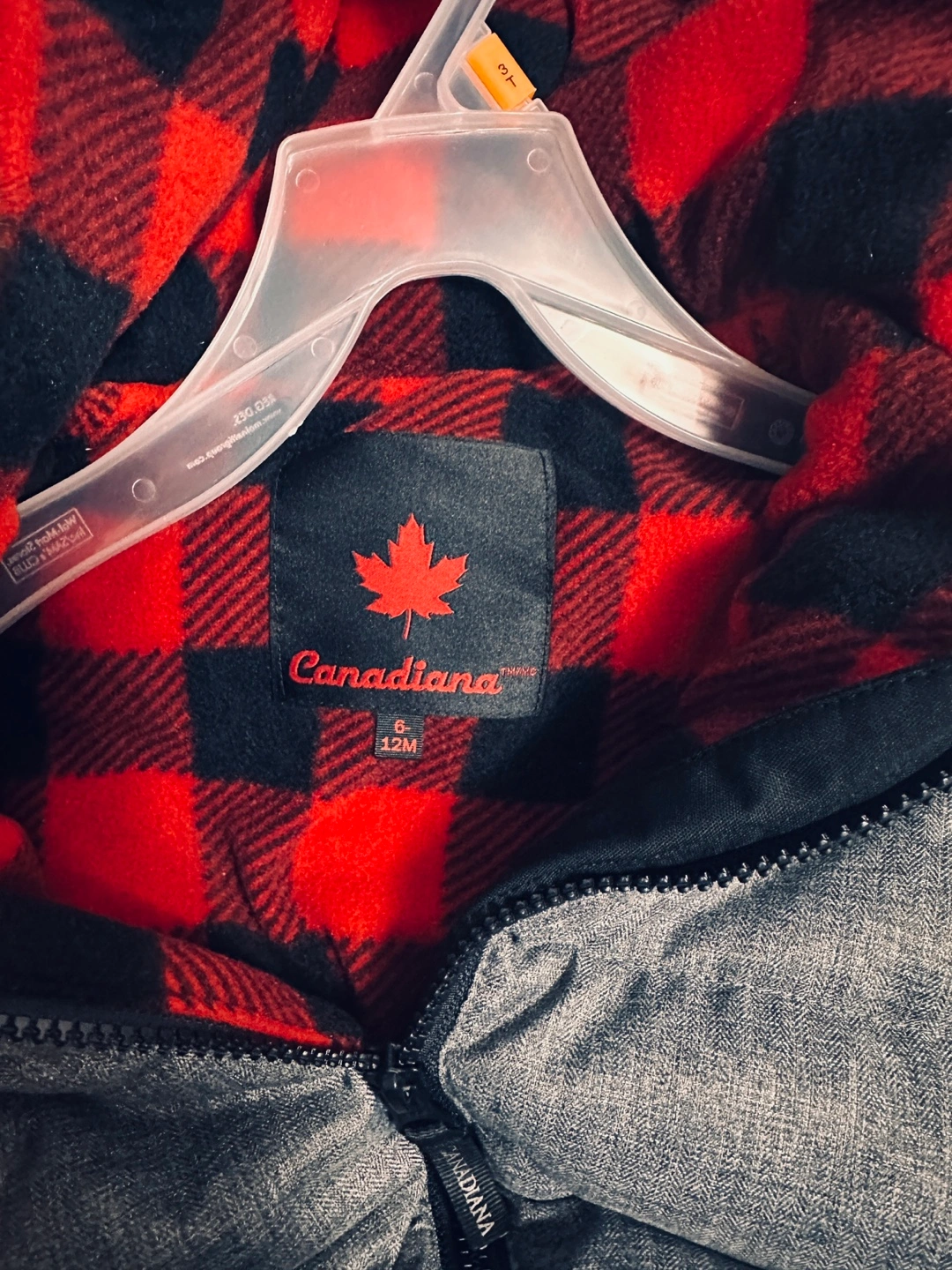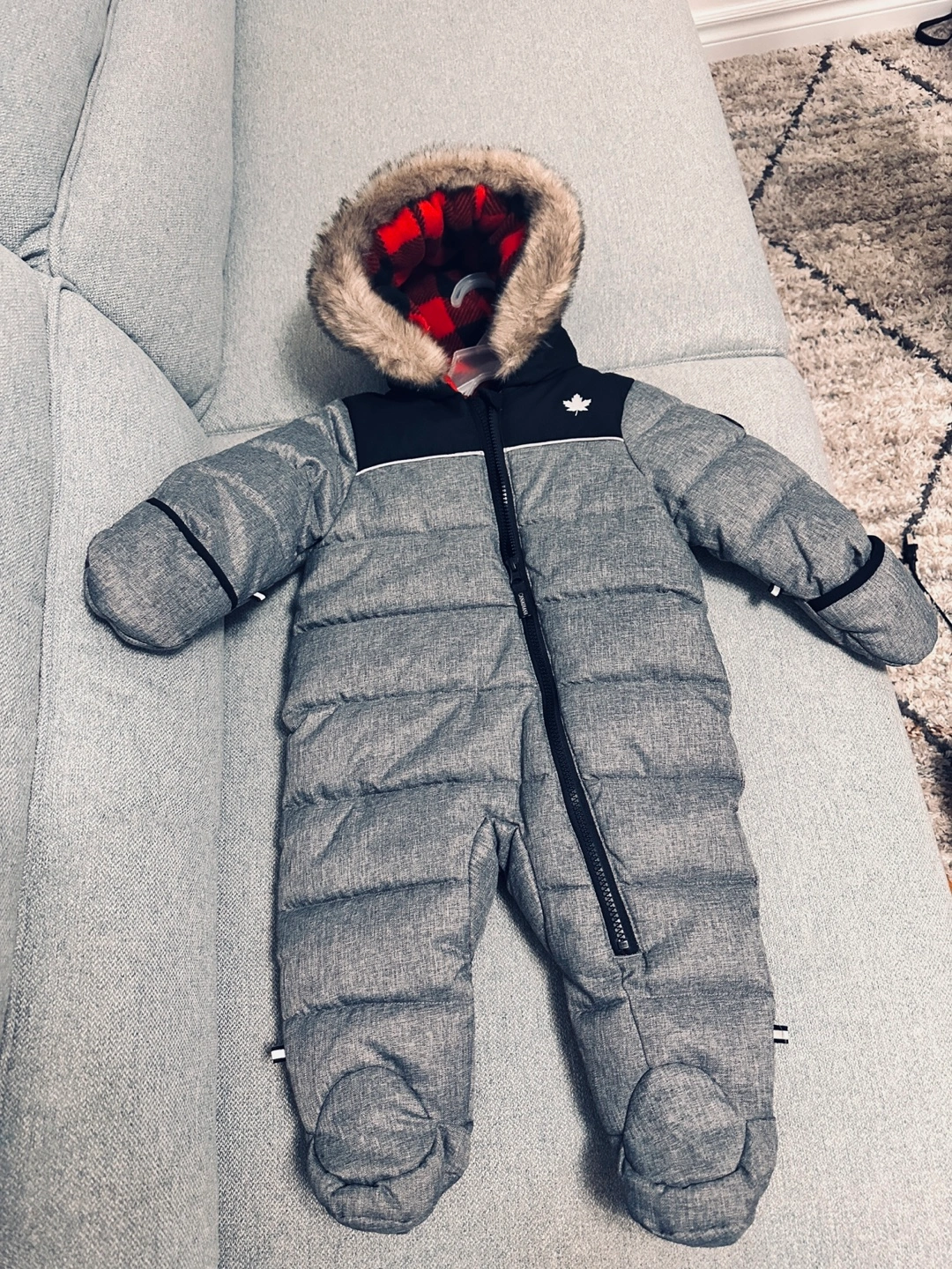 Keep your little one warm this winter with this Canadiana snowsuit! It's in great condition and perfect for babies aged 6-12 months. The snowsuit features a cozy, red and black plaid lining and a stylish grey exterior.