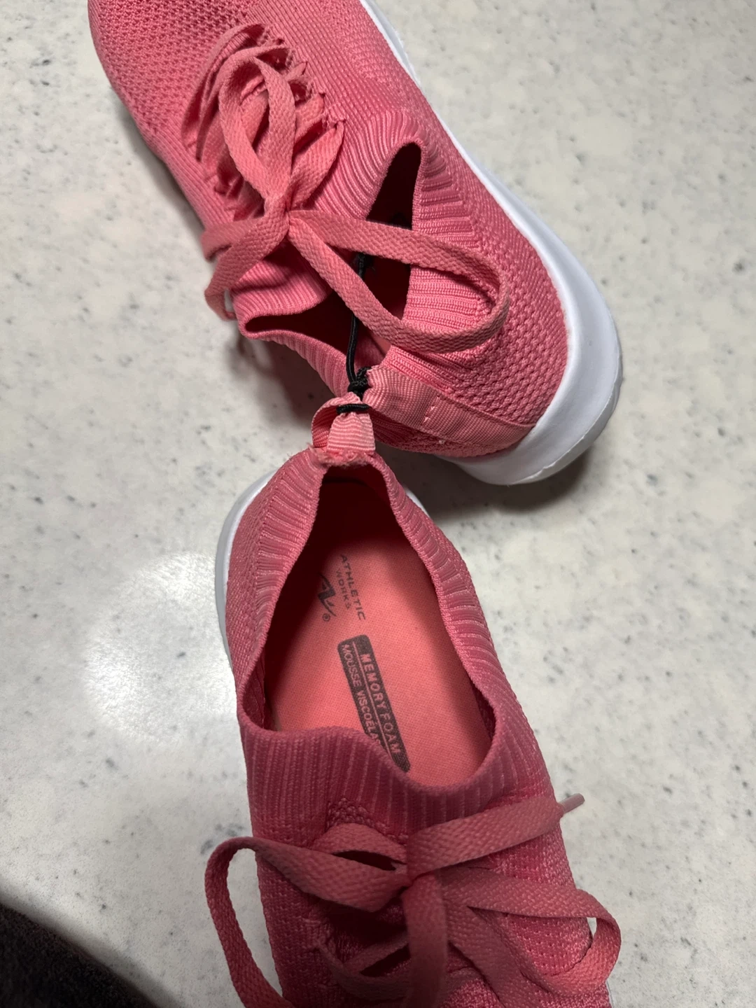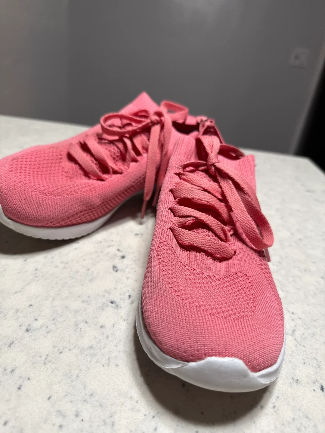 These Athletic Works sneakers are perfect for everyday wear! They are a knit material and a lovely shade of pink. The insoles feature memory foam for extra comfort. Size 7
