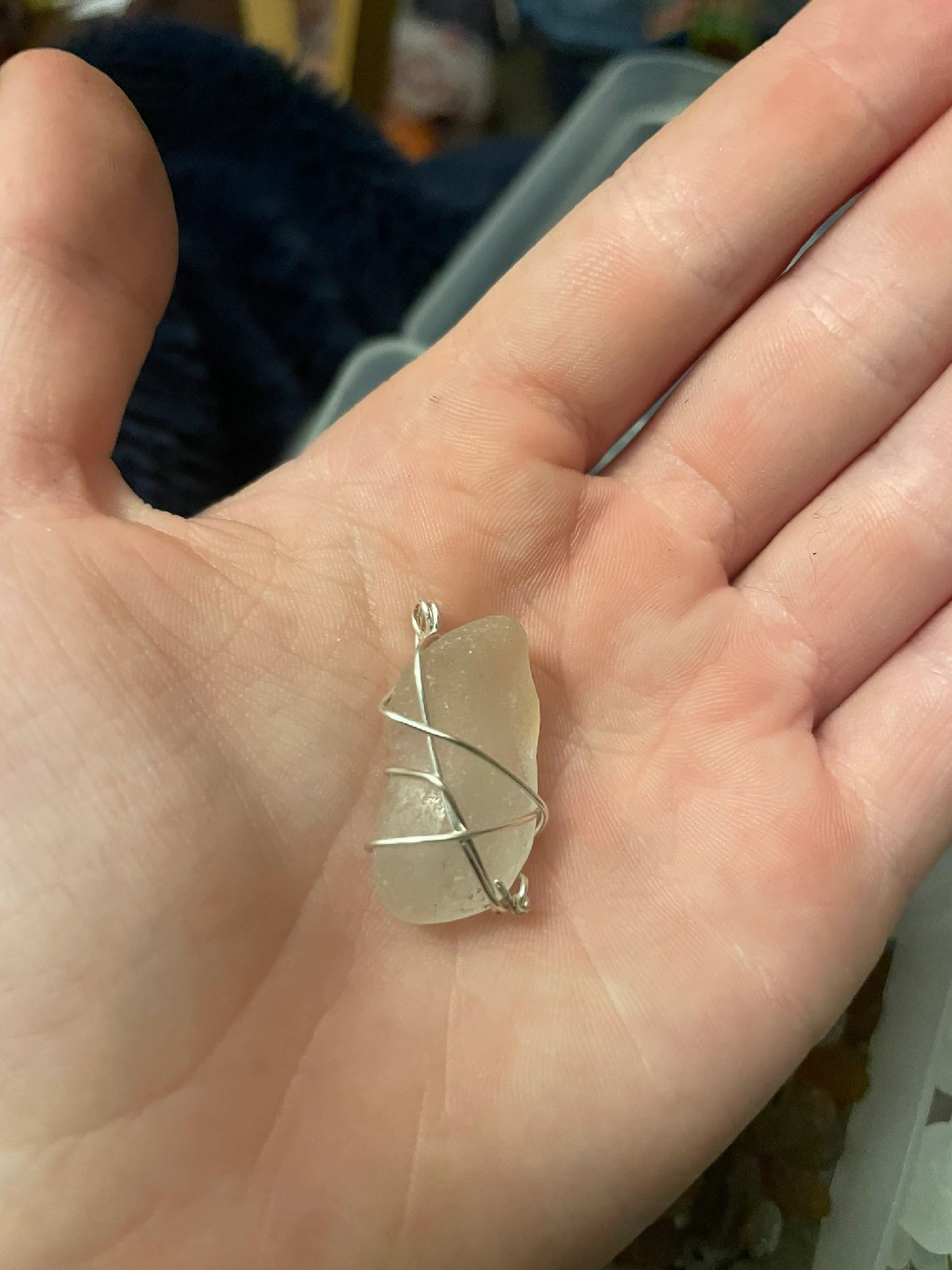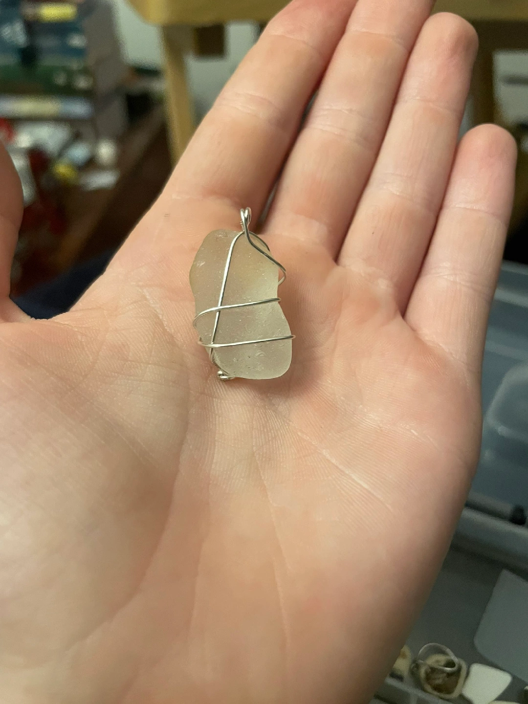 I'm selling a handmade sea glass pendant. It's a unique piece of jewelry made with a piece of sea glass wrapped in wire. It's perfect for anyone who loves the ocean or unique, handcrafted items!
