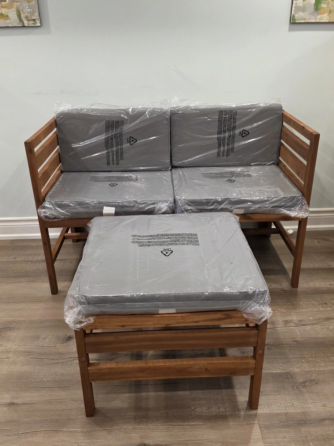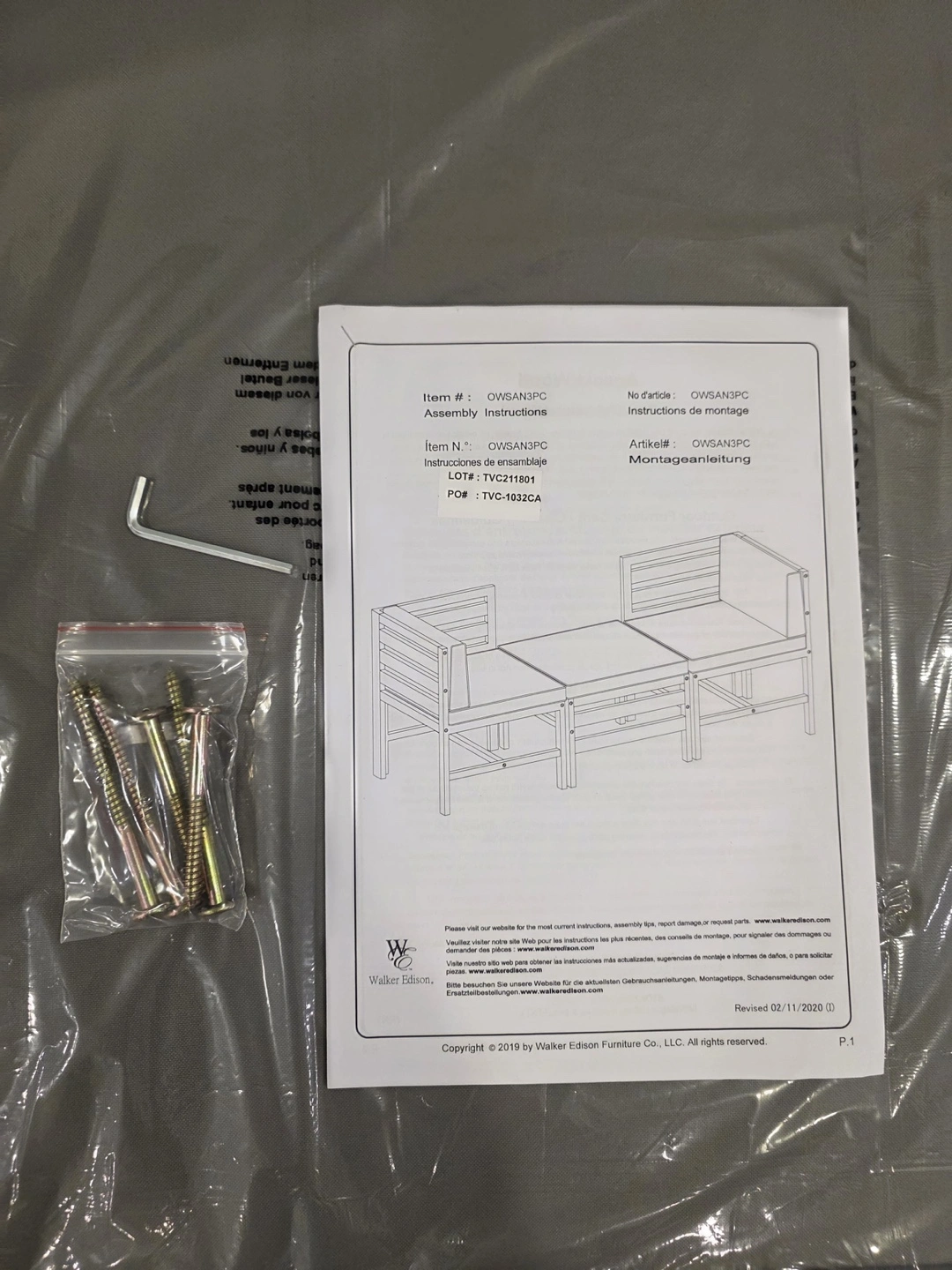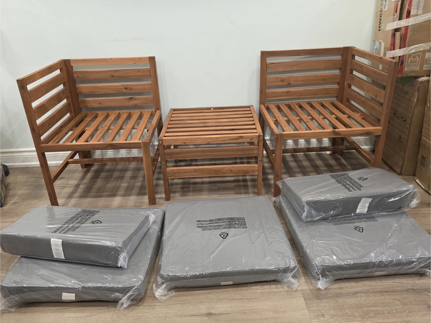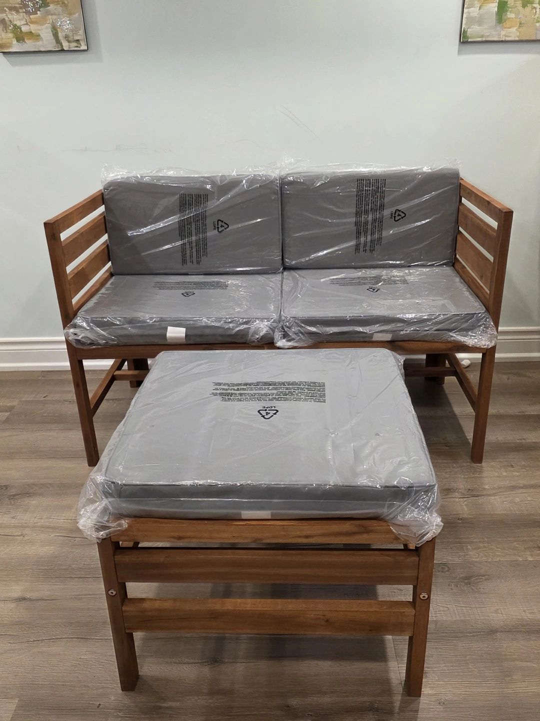 Selling a brand new Walker Edison outdoor patio set! It includes two chairs and a coffee table, perfect for enjoying the nice weather. The set is still in its original packaging, never been used. Assembly instructions and hardware are included. The model number is OWSAN3PC.
