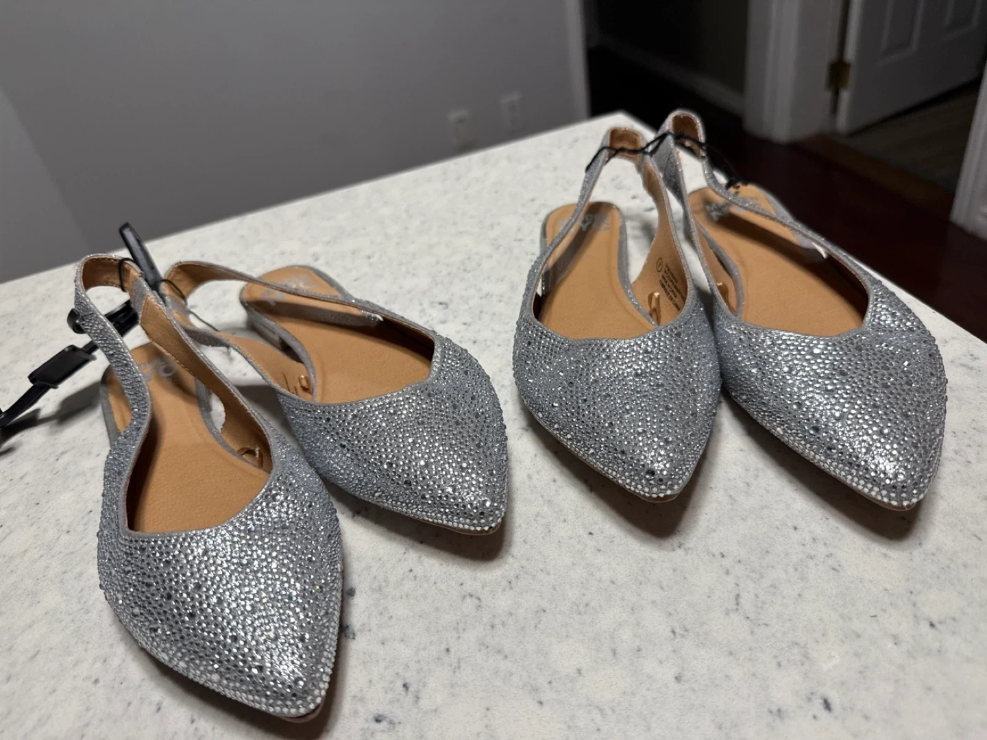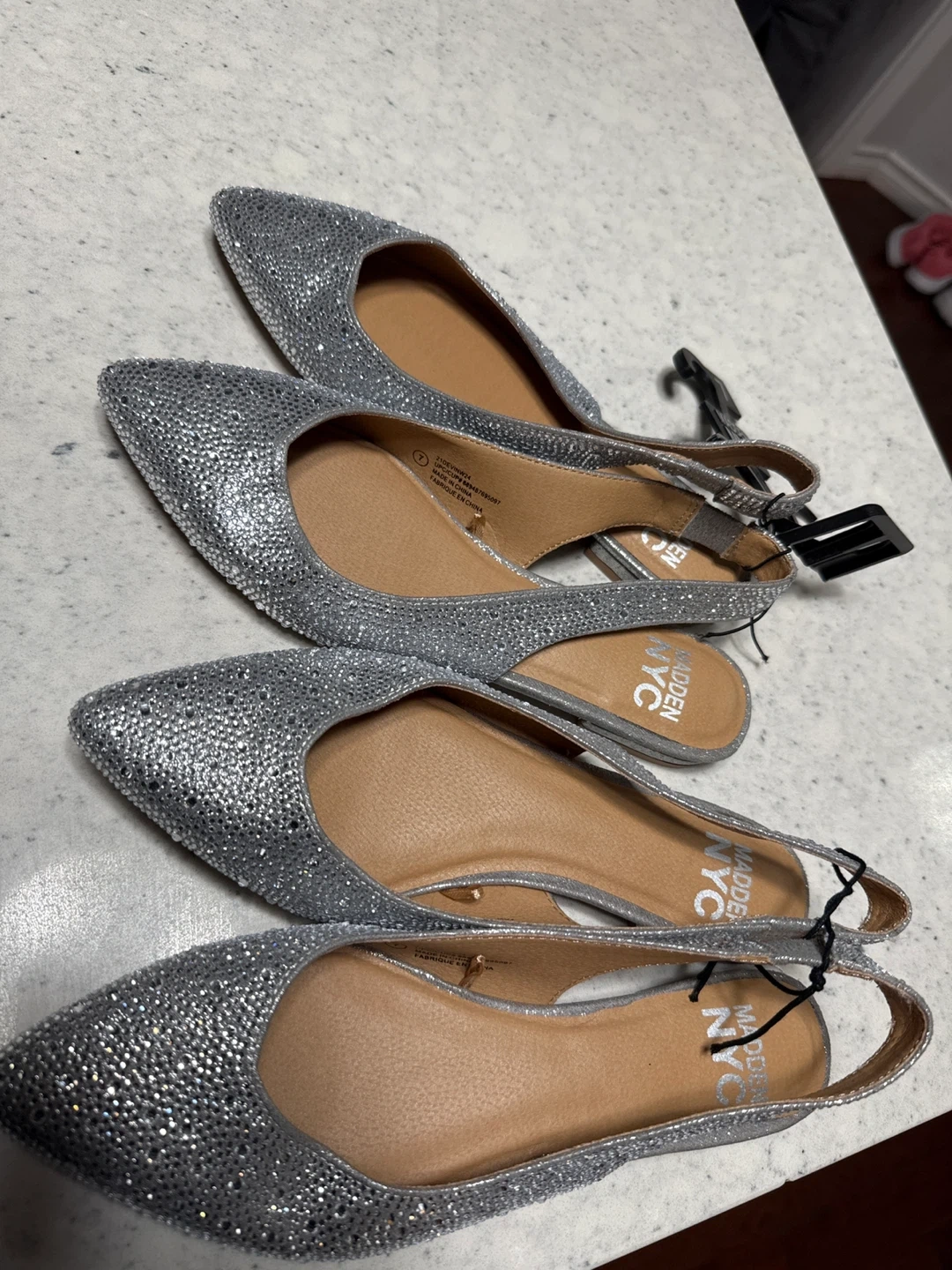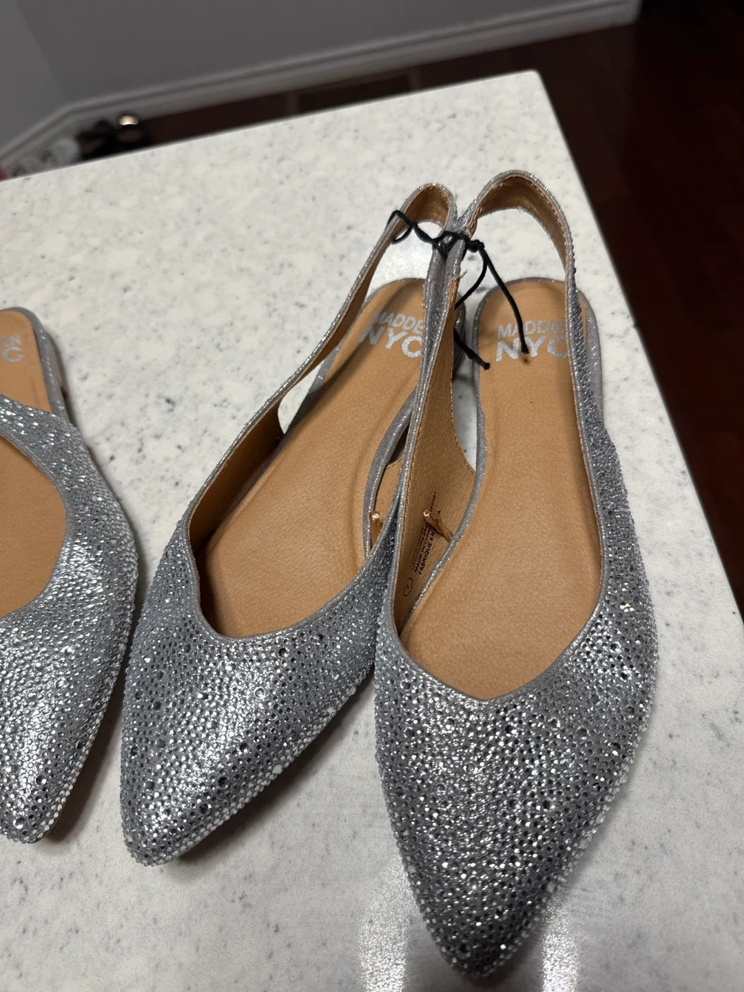 These are a pair of Madden NYC slingback flats in a sparkly silver colour. They're a size 7 and have a pointed toe. Perfect for adding a bit of sparkle to your outfit!