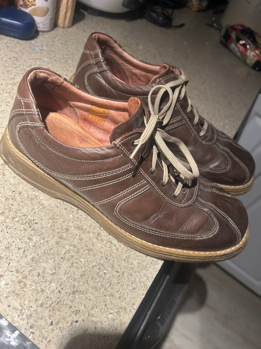Pair of brown leather shoes. They are marked as size 43 which is a men’s size 10. They show signs of wear, but are very comfortable and still have lots of life in them