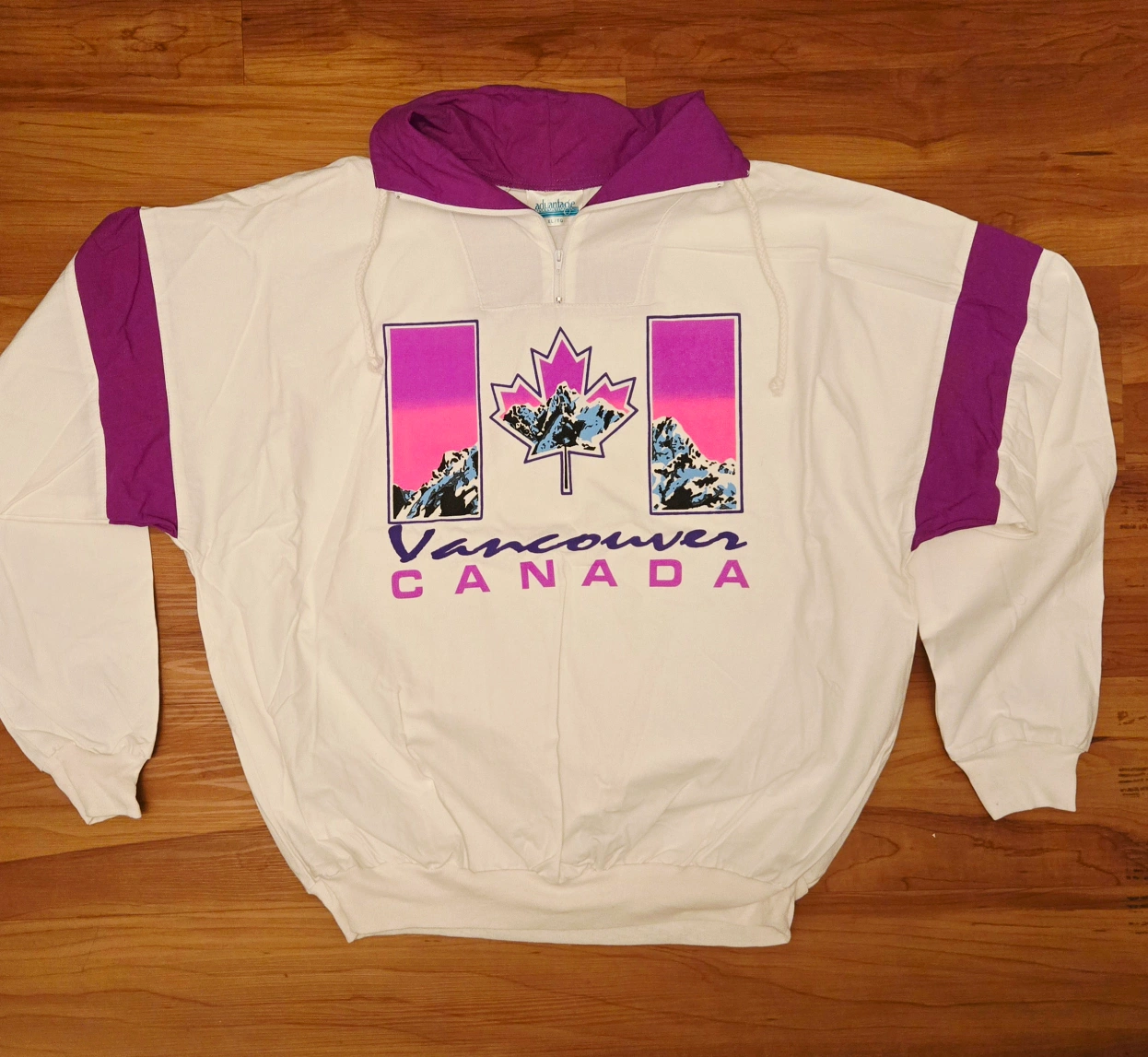 Selling a brand new true vintage pullover jacket! It's white with purple accents and features a Canadian flag design with mountains. Great for a retro look! - brand new with tags - 100% cotton, excellent vintage quality and fit! - Size XL, unisex - made in Canada ๐จ๐ฆ - can also meet in Fairview โโ My family had a Tshirt Business in the 80's & early 90's. This is left over stock. Check my page often for LOTS more Adult's & Children's Tshirts to come! โโ