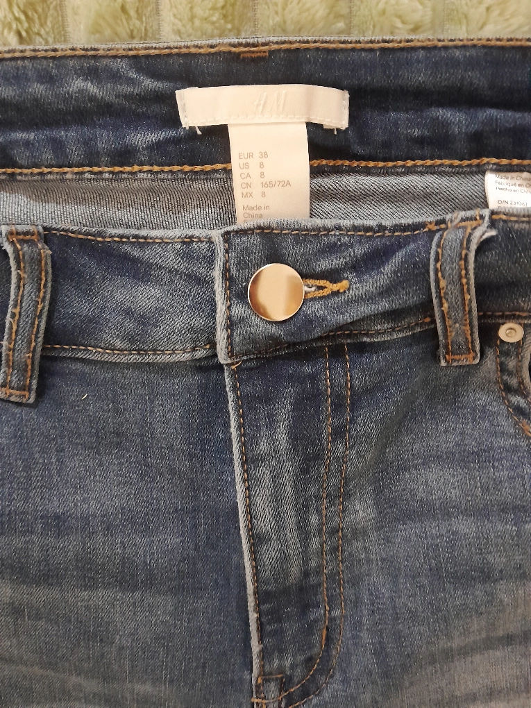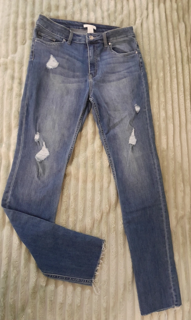Selling a pair of H&M denim jeans in a size 8. They are in good condition and have a stylish distressed look with some rips. Perfect for casual wear!