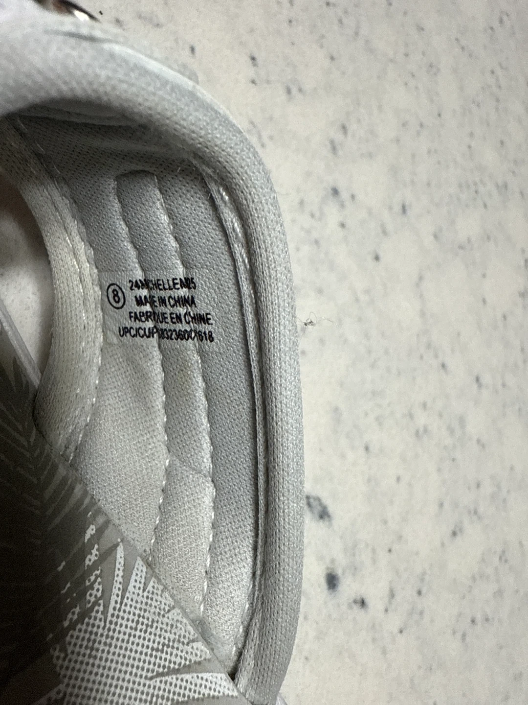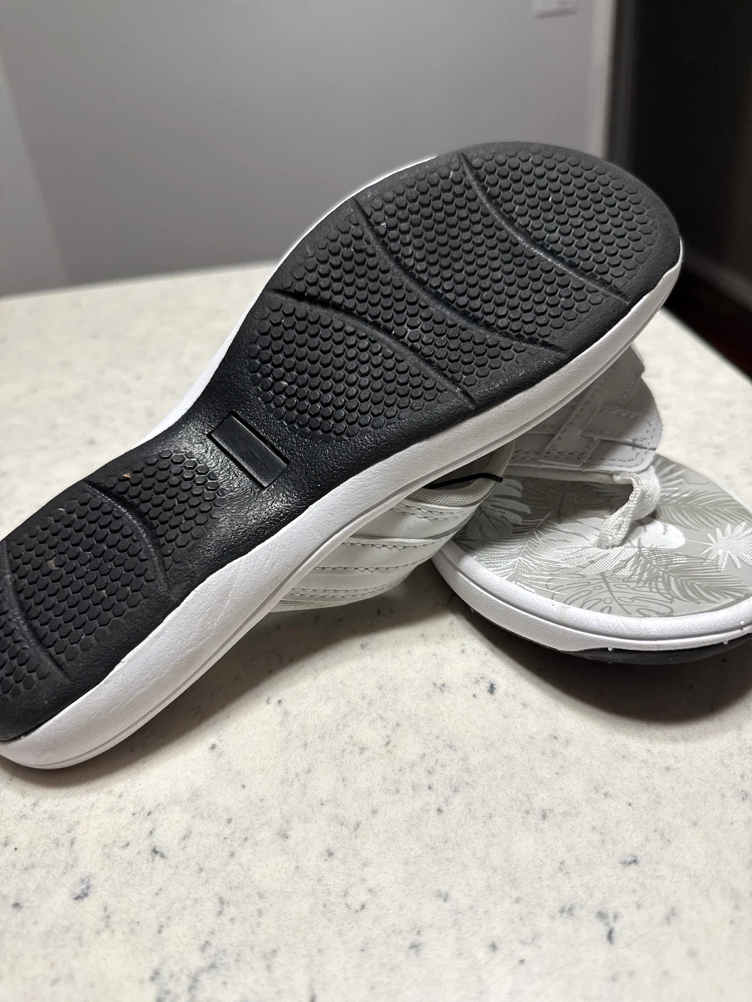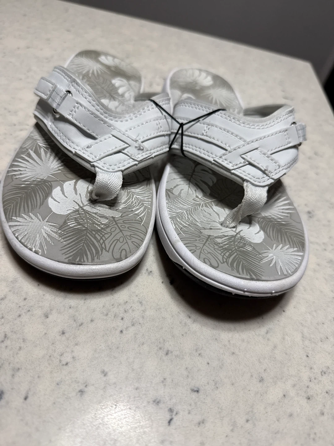 Selling a pair of white SHELLIE sandals in size 8. They feature a stylish leaf pattern on the insole and a comfortable thong design. The soles are in great shape and ready for summer!