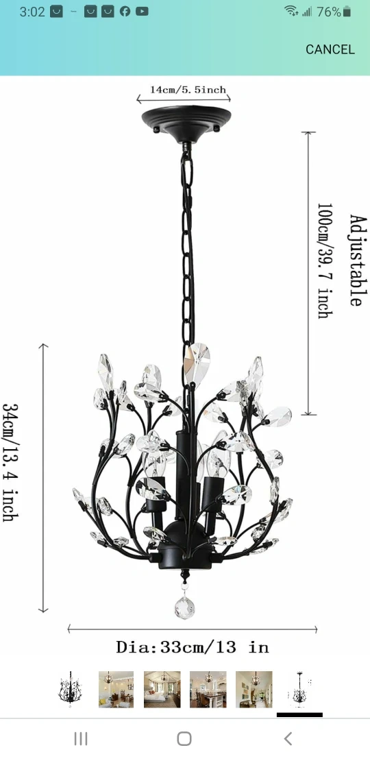 Selling a beautiful flush mount chandelier with crystal accents! It's a black fixture with three lights, perfect for a bedroom, living room, or dining room. The dimensions are approximately 34cm/13.4 inches in height and 33cm/13 inches in diameter. It also comes with gloves to protect the chandelier when installing