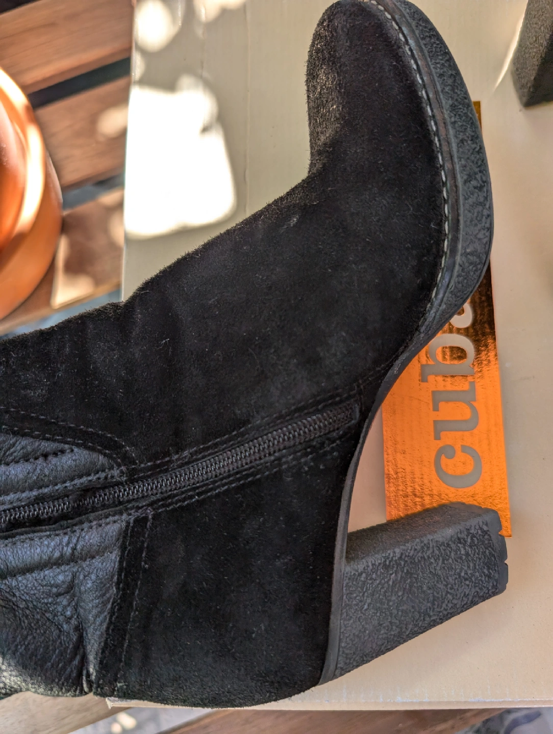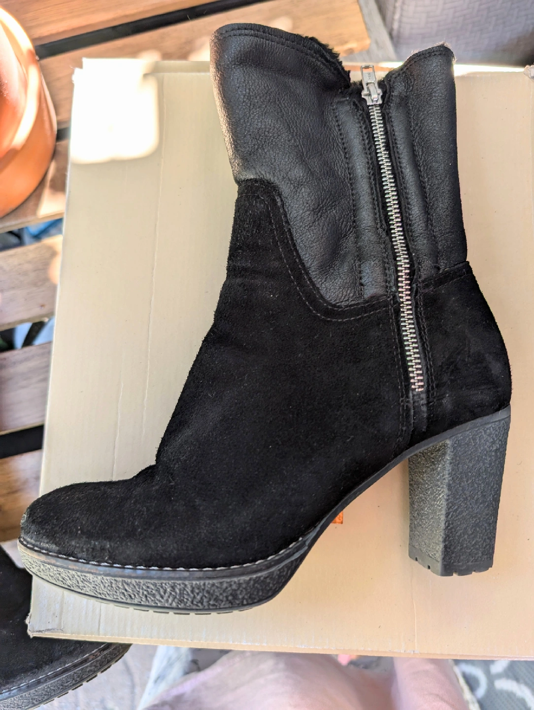 These boots are a stylish addition to any wardrobe! They feature a combination of black suede and leather, with a convenient side zipper. Perfect for adding a touch of sophistication to your look! Bought for $339 Some wear on toes, not terribly noticeable. Rubber in great condition Can't wear heels anymore, so must sell Cash only, no etransfers No holds, first come first serve Etobicoke meetup. Rathburn & Renforth