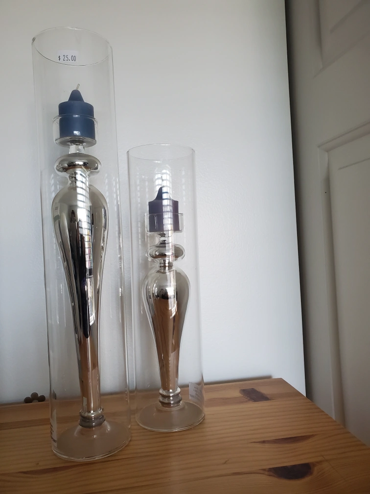 Selling two candle holders, each with a glass cylinder. They're a stylish way to add some ambiance to any room. Originally bought for $25 each they're in Brand new and ready for a new home Candles not included