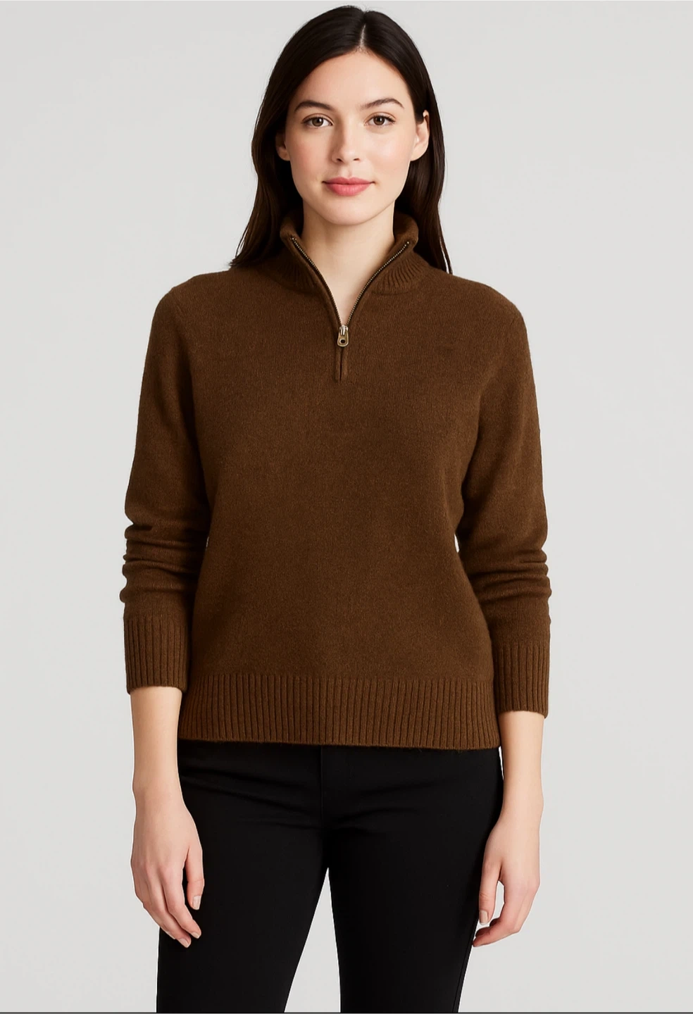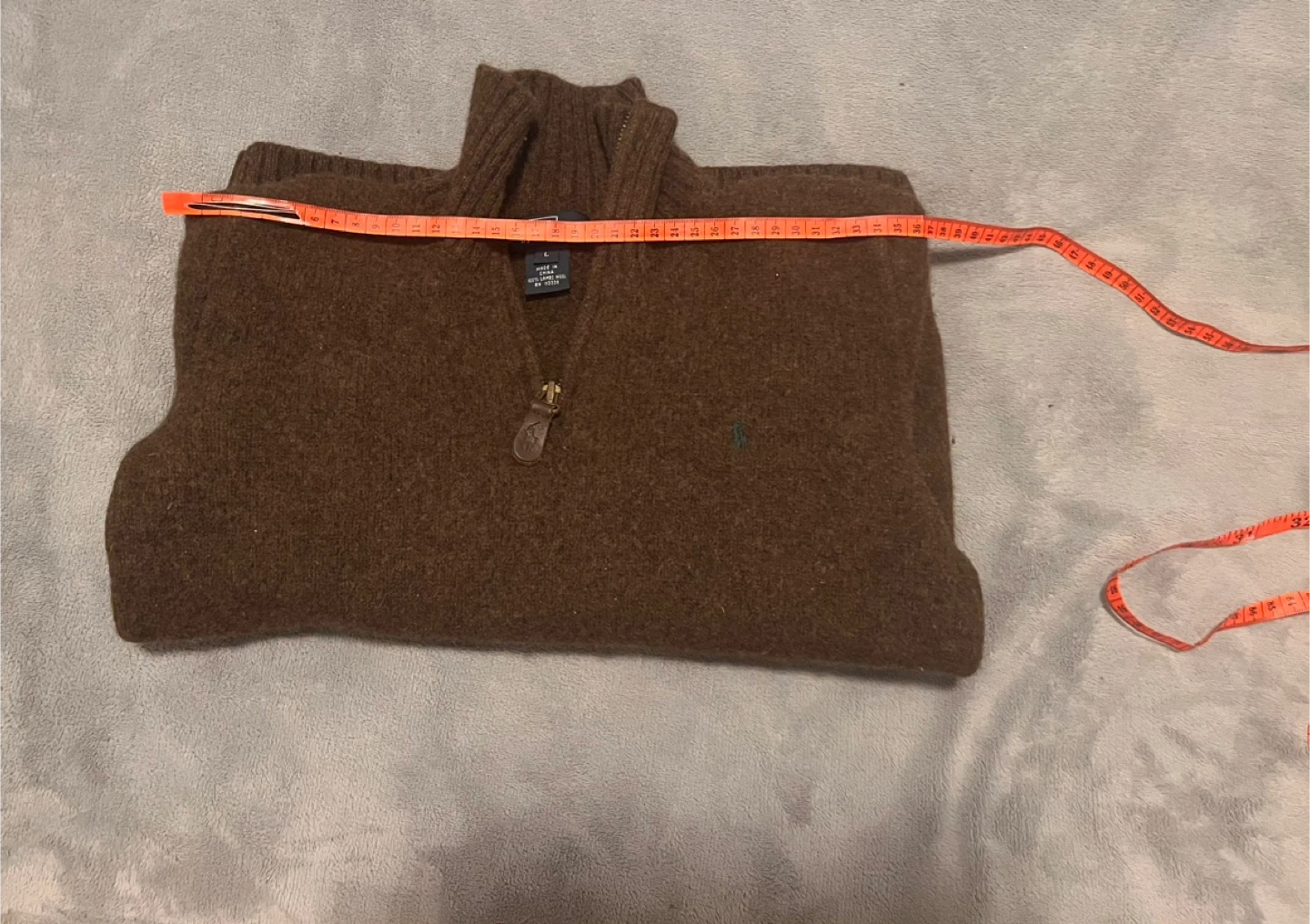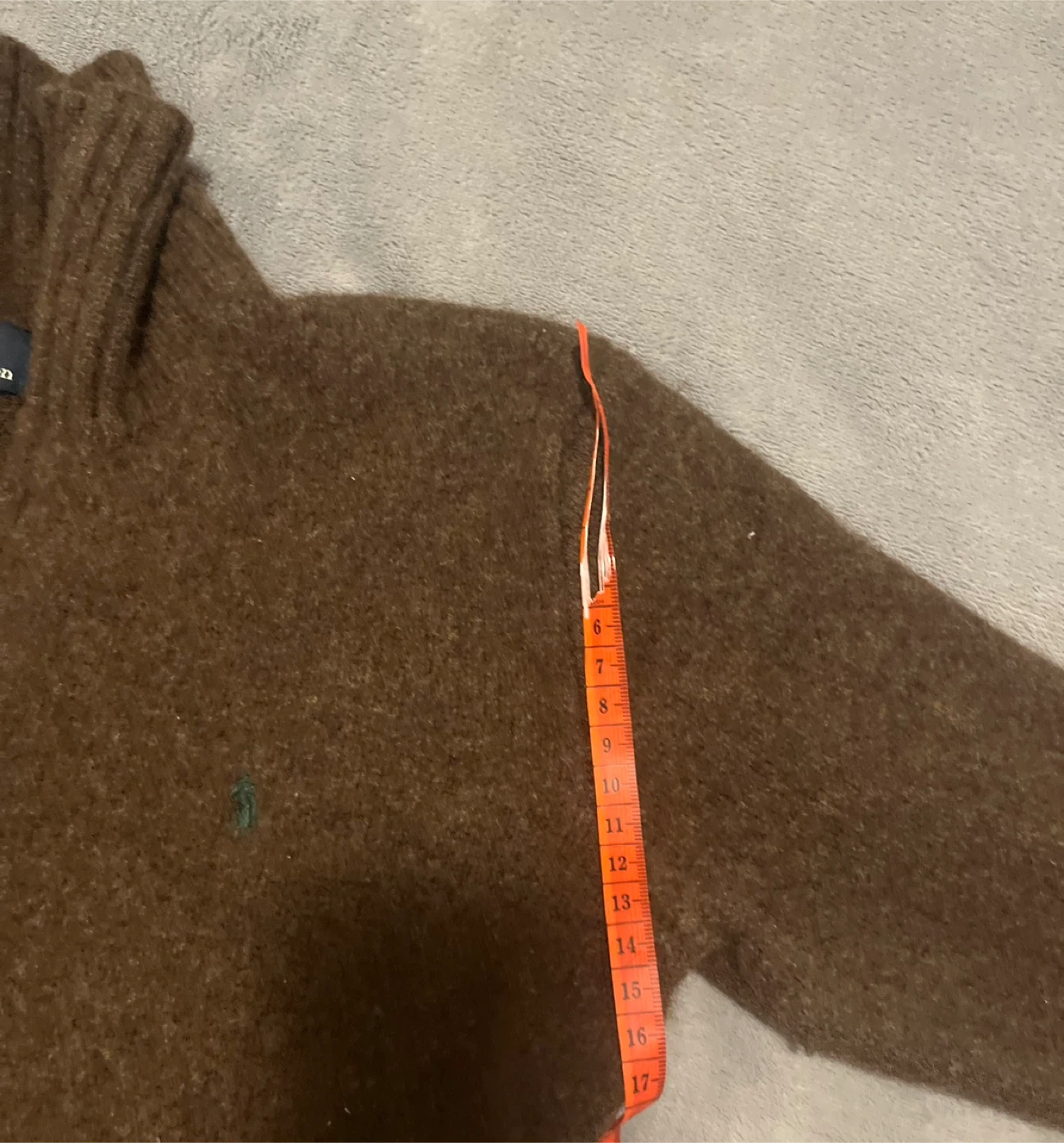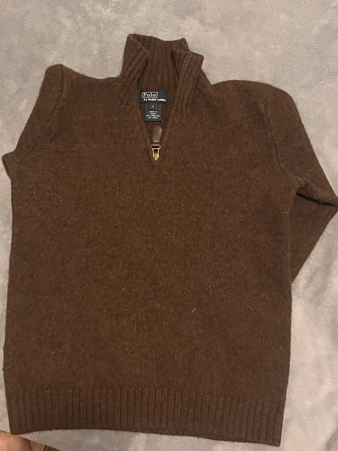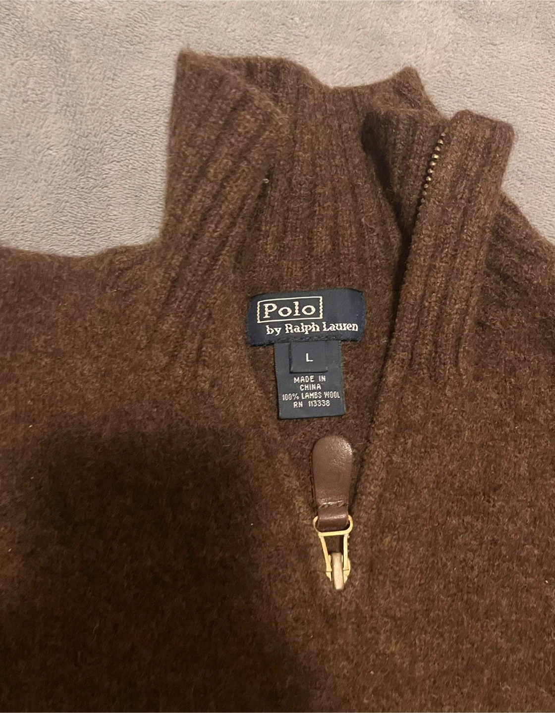 Cozy Polo Ralph Lauren half-zip sweater in a lovely brown colour! It's made of 100% lambswool and is a size large. Perfect for staying warm and stylish during the cooler months