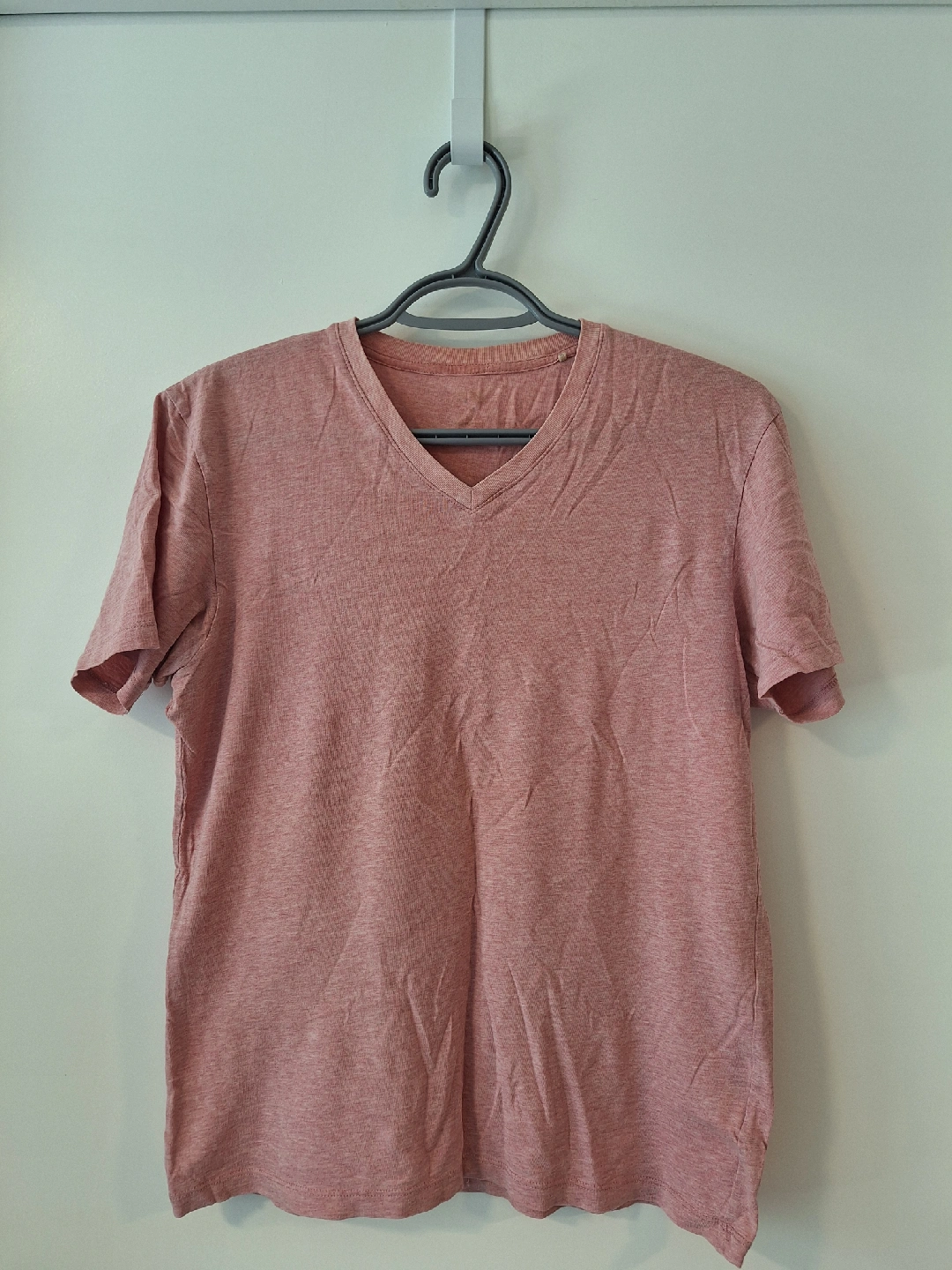 Selling a gently used pink V-neck t-shirt. It's in great condition and would be a nice addition to your wardrobe.