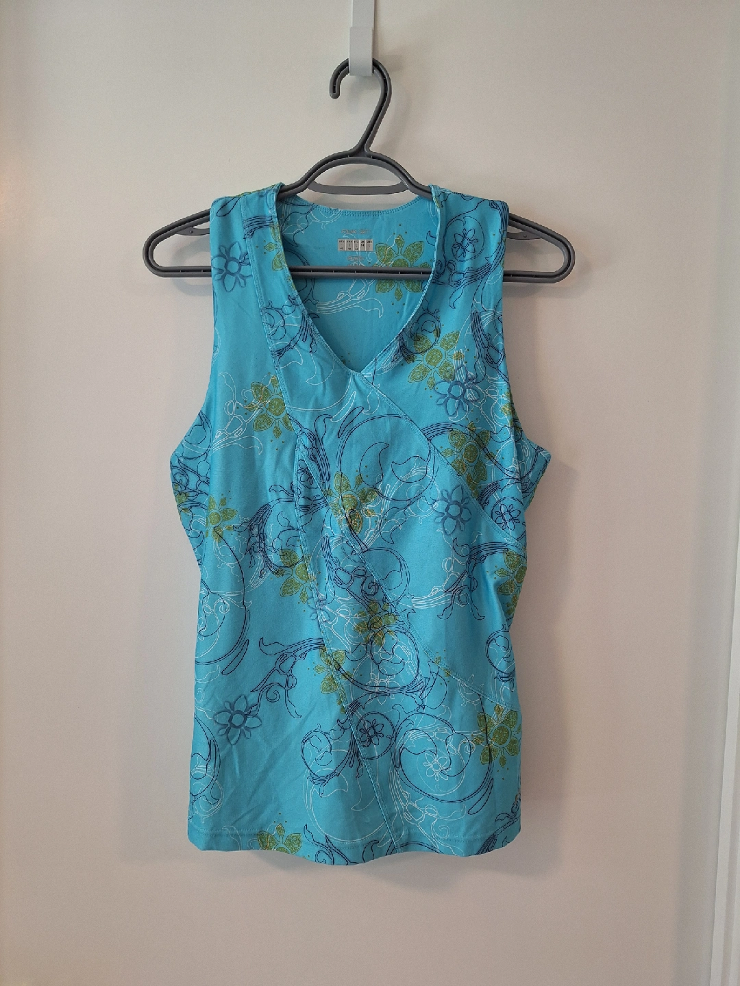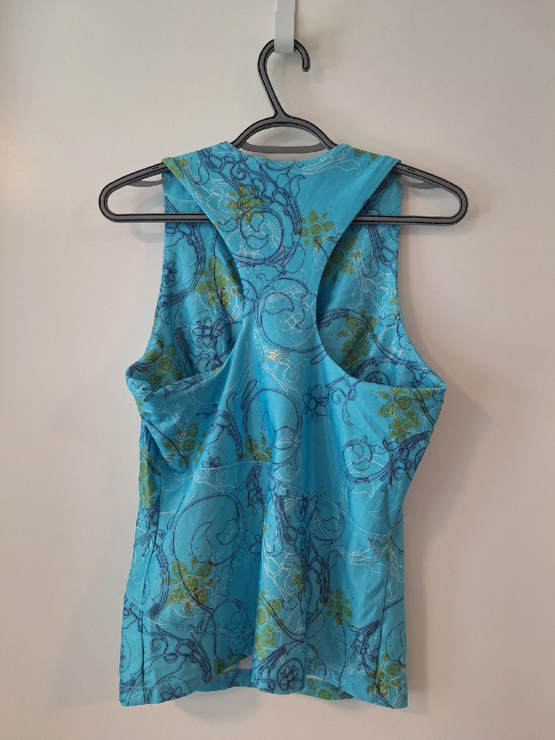 Selling a Reebok Play Dry tank top in size L. It's a light blue colour with a floral pattern. Perfect for workouts or casual wear! Built in shelf bra. Excellent condition.