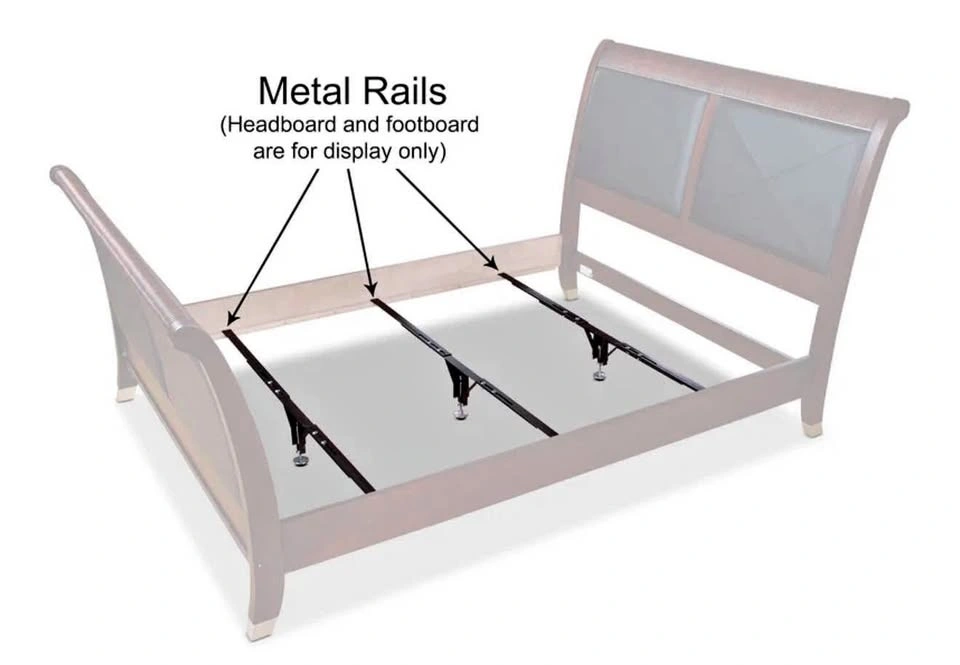 Dimensions: Width: 76" (193.0 cm) Height: 12" (30.5 cm) Depth: 1" (2.5 cm) Durable metal rails easily hold your bed in place. Easy to adjust to suit king, queen and full mattresses. Adds extra support to your bed's wooden slats. Fits several different bed heights thanks to the adjustable legs. Headboard, footboard, wooden slats and side rails not included. Never used. 2 sets are available.
